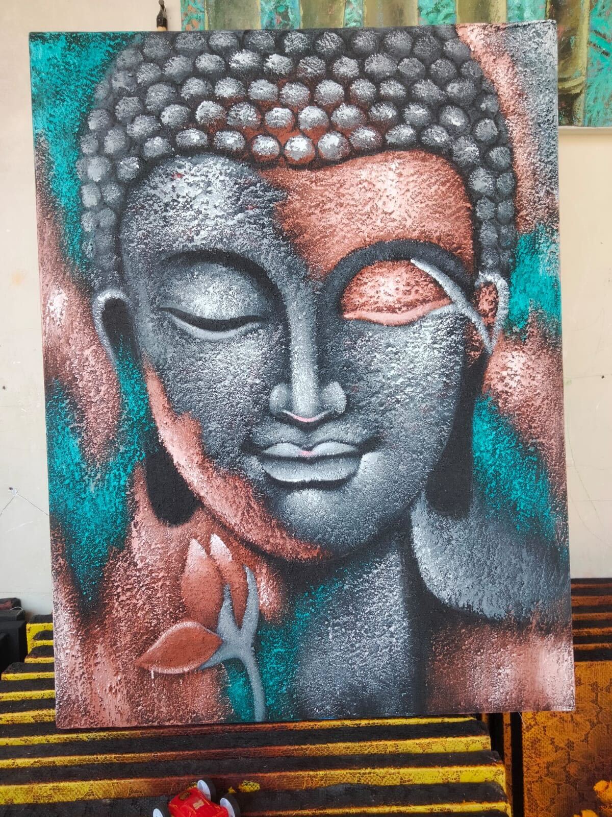 Dank der strukturierten Details und der edlen Farbpalette bietet dieses Gemälde nicht nur spirituelle Bedeutung, sondern fungiert auch als elegantes dekoratives Statement. Perfekt für Einzelhändler, die ihren Kunden bedeutungsvolle und zugleich auffällige Kunstwerke für jedes Interieur anbieten möchten.