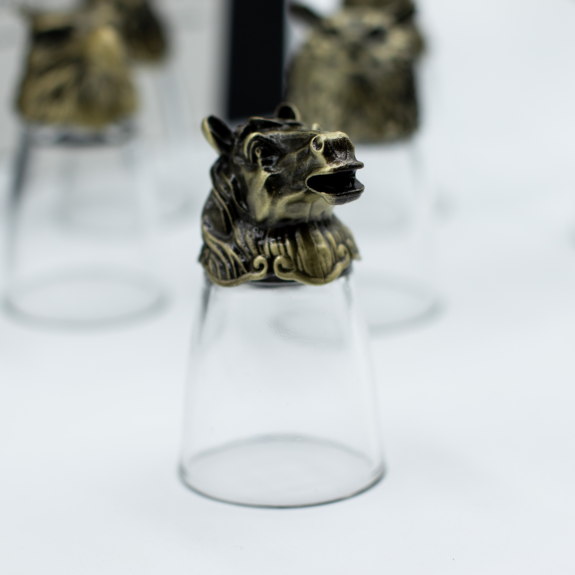 Jedes 25-ml-Glas ist handgefertigt aus klarem Glas mit einem massiven Messingboden und detailreichen Tier- oder Fabelmotiven.
