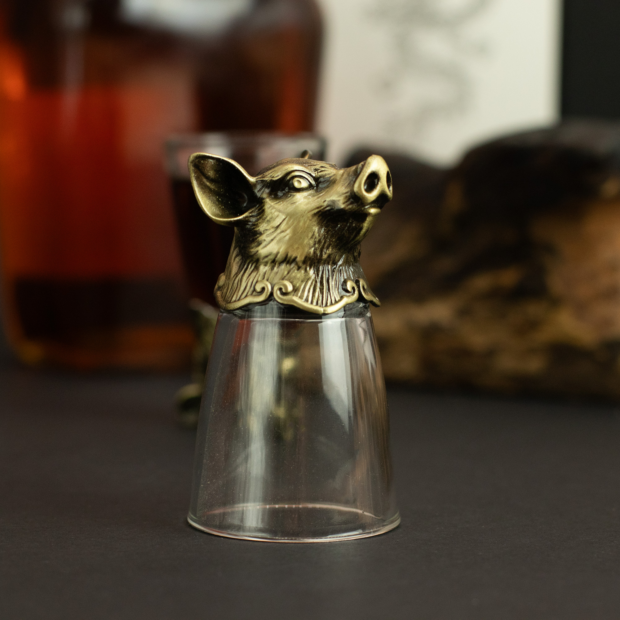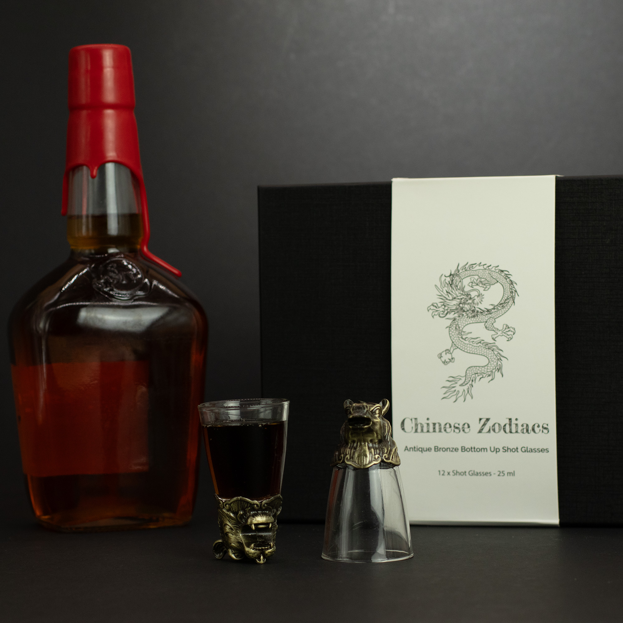 Jedes 25-ml-Schnapsglas hat einen Messingboden in Form eines der zwölf Tierkreiszeichen – von Drache über Hase, Tiger bis hin zu Pferd. Feine skulpturale Details prägen das Glas, wenn man es umdreht.