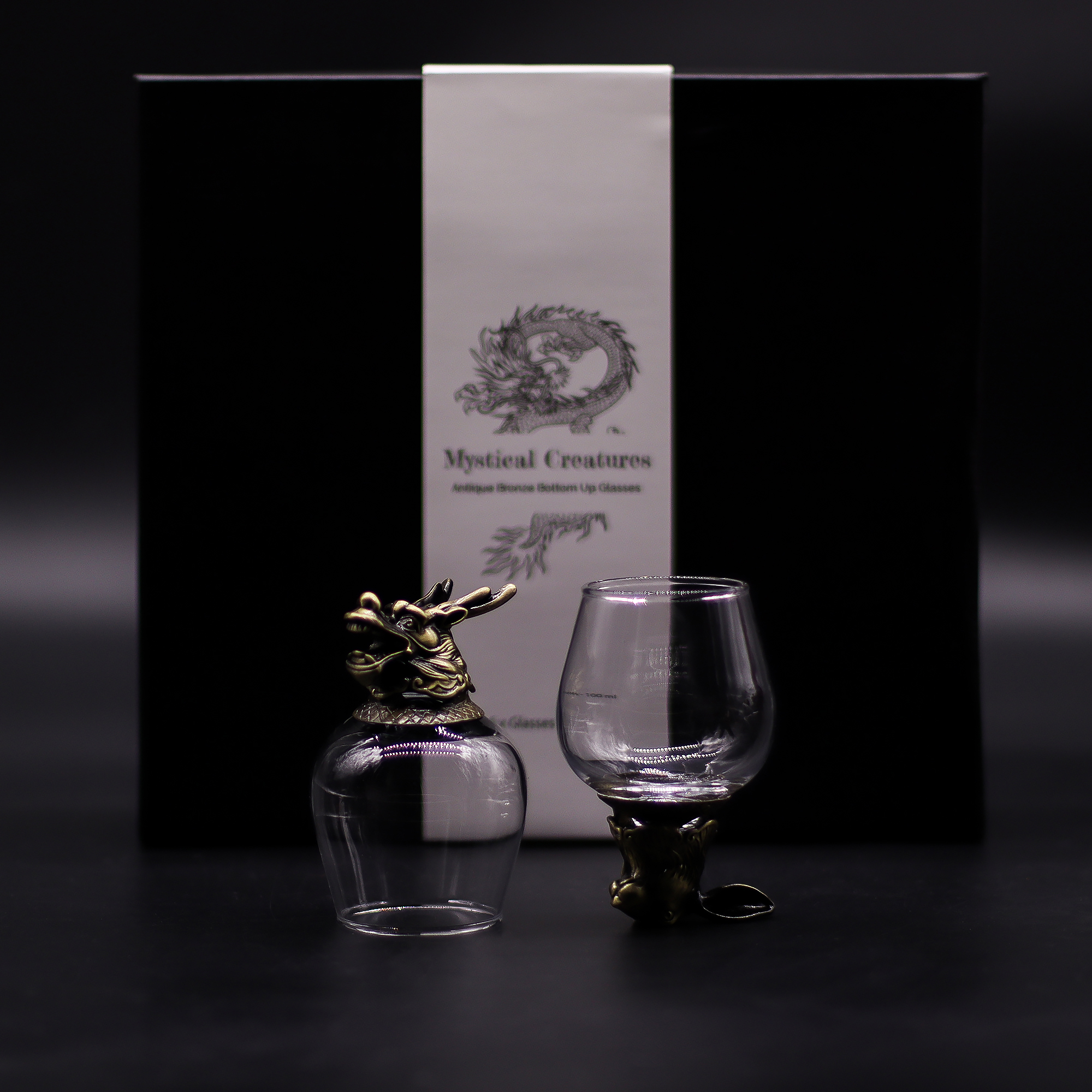 Jedes Glas verfügt über einen schweren Messingfuß, der in Form von Fabelwesen wie Drache, Kobra, Tiger, Elefant, Ziege und Widder geformt ist – wunderschön detailliert und voller Charakter. Beim Umdrehen entfaltet sich die Figur in ihrer ganzen Pracht und macht jedes Stück zu einem kleinen Kunstwerk.