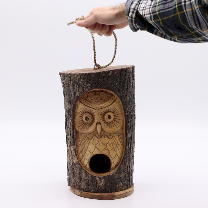 Diese handgefertigten Vogelhäuser aus Baumstämmen aus Bali sind einzigartige Kunstwerke, direkt aus natürlichem Holz geschnitzt. Das rustikale Design des Tree Trunk Face – Vogelhaus – Weise Eule zeigt ein charaktervolles, ausdrucksstarkes Gesicht, das jedem Stück eine unverwechselbare Präsenz verleiht.