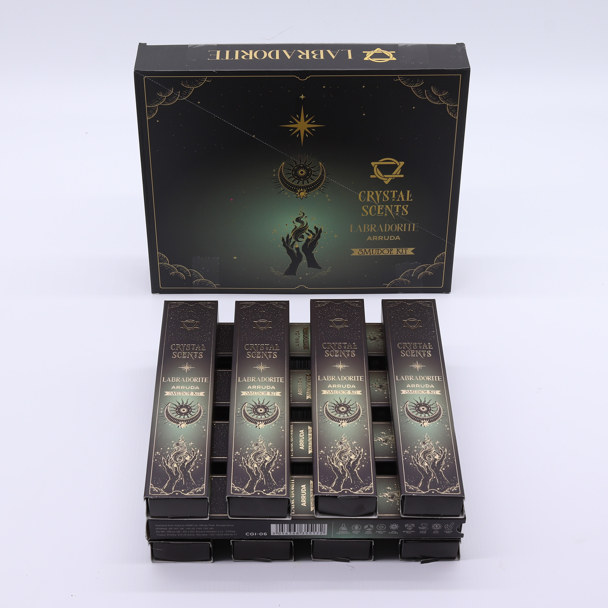 Jede Packung enthält 10 handgefertigte Räucherstäbchen und einen echten Labradorit-Kristall – ideal für spirituelle Boutiquen und Händler mit Fokus auf Wellness. Kund:innen wählen diese Kombination oft in Übergangsphasen oder wenn sie eine erdende, intuitive Umgebung schaffen möchten.
