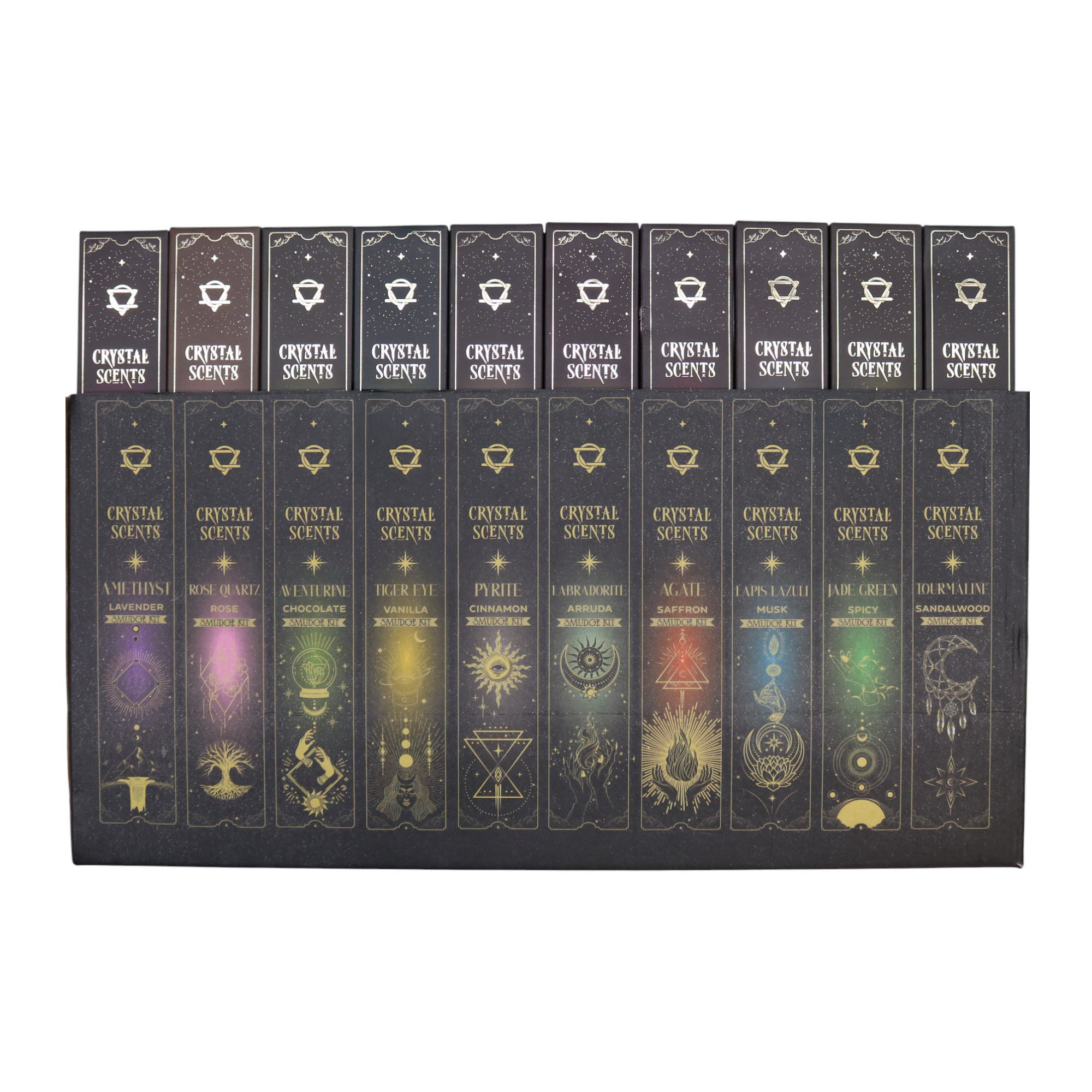 Ein komplettes, vielseitiges Set – perfekt, um Kund:innen die volle Kraft und Vielfalt der Crystal Scents Räucherstäbchen-Kollektion vorzustellen.