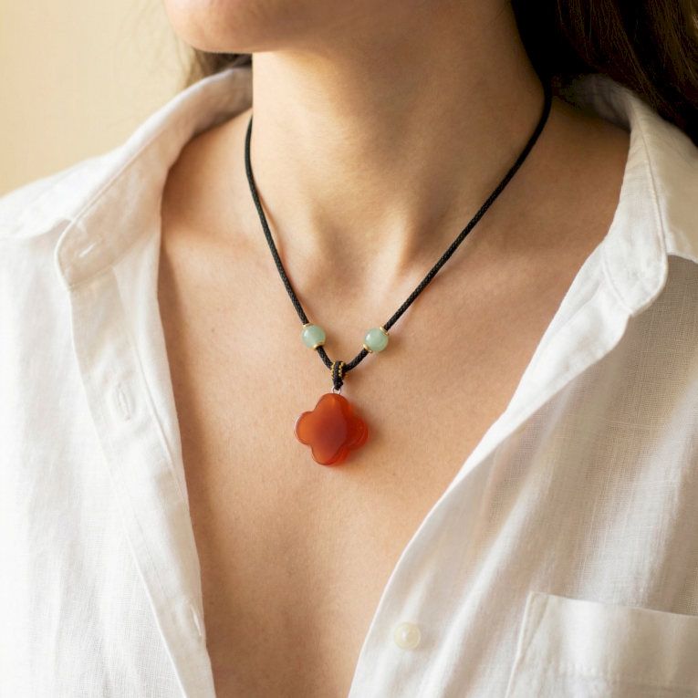 Anhänger aus Edelsteinen, die in Symbole geschnitzt sind, mit denen Menschen intuitiv eine Verbindung herstellen – Herzen für Zuneigung, Monde für Wandel, Kreuze zum Schutz, Pilze und organische Formen, die Natur und Neugier widerspiegeln.