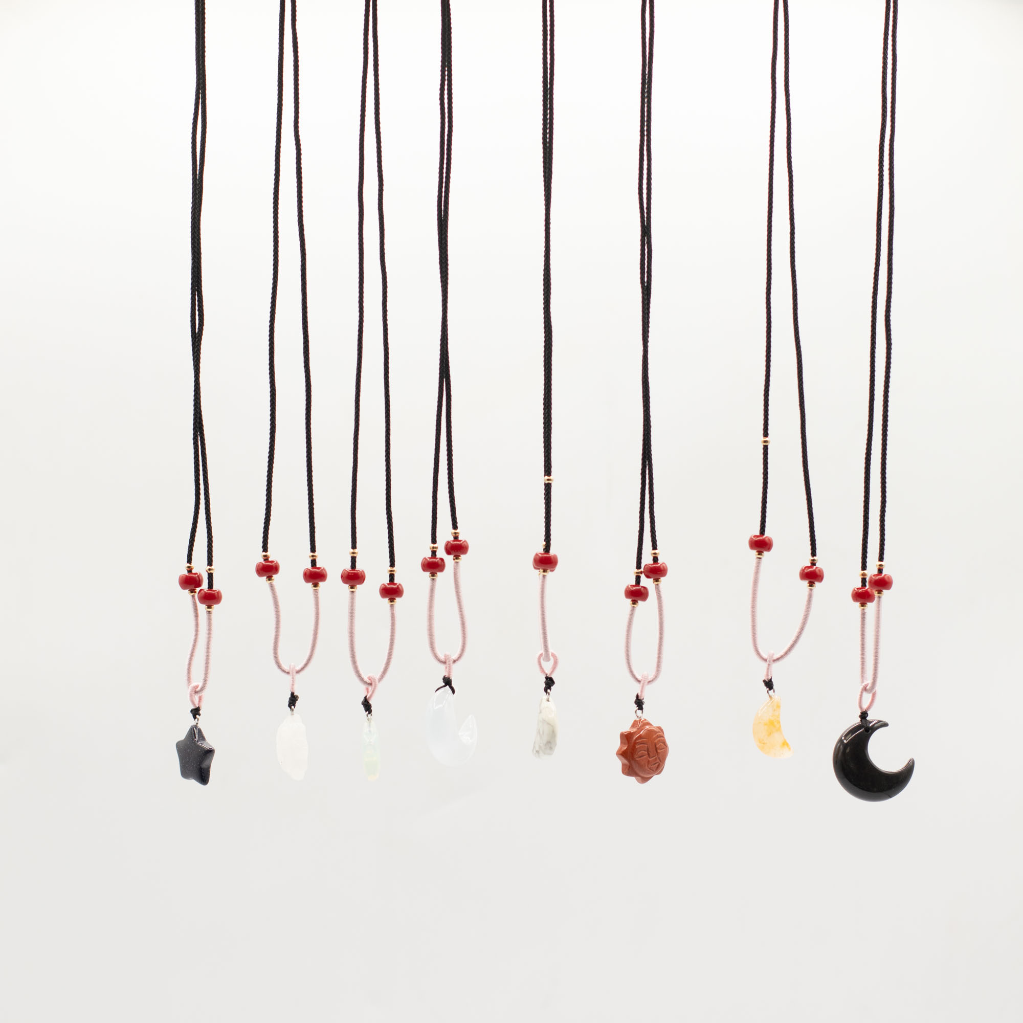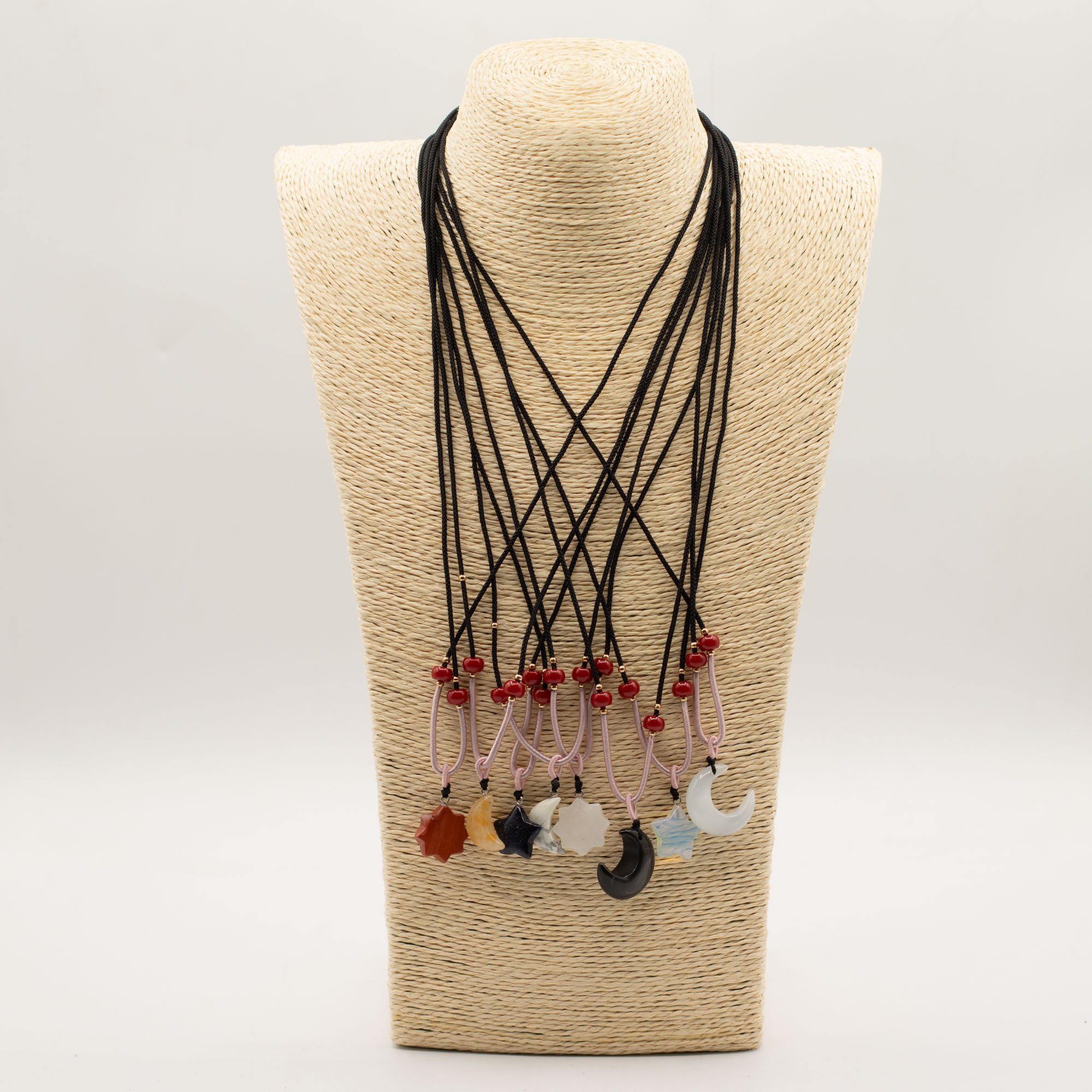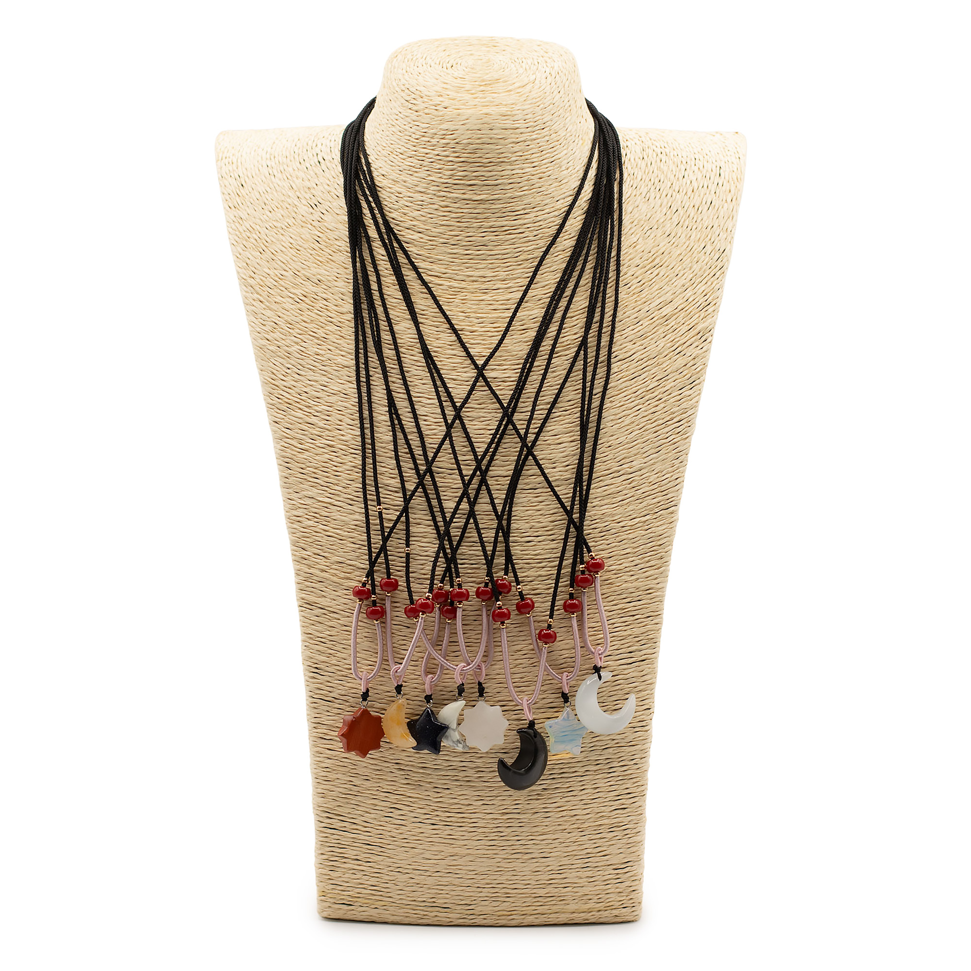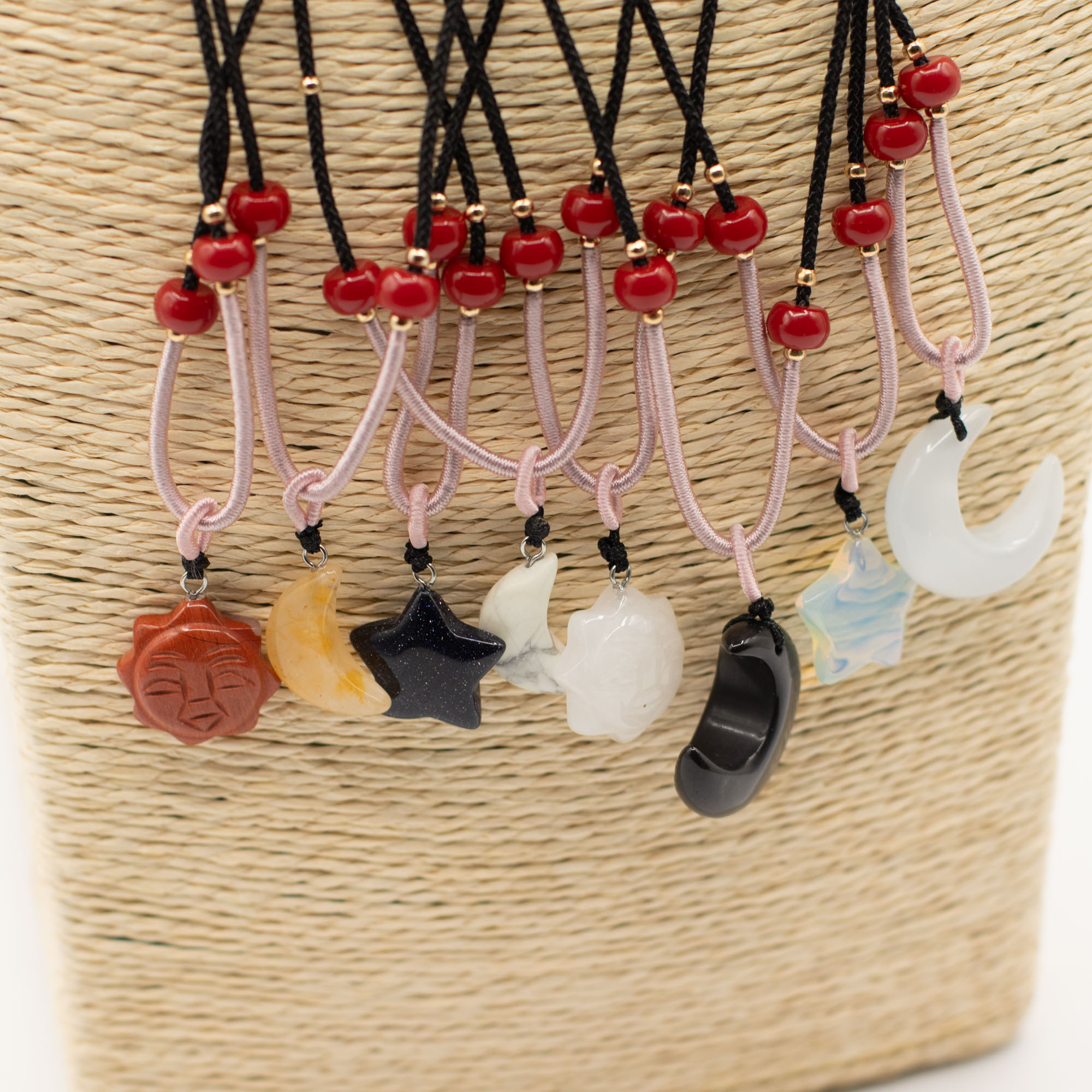 Die Kollektion umfasst eine Vielzahl beliebter himmlischer Motive wie Sonne, Mond und Sterne, gefertigt aus verschiedenen natürlichen Edelsteinen. Jeder Anhänger wird an einer verstellbaren Kordelhalskette mit dekorativen Perlendetails präsentiert, sodass ein sofort verkaufsbereites, optisch ansprechendes Schmuckstück entsteht.