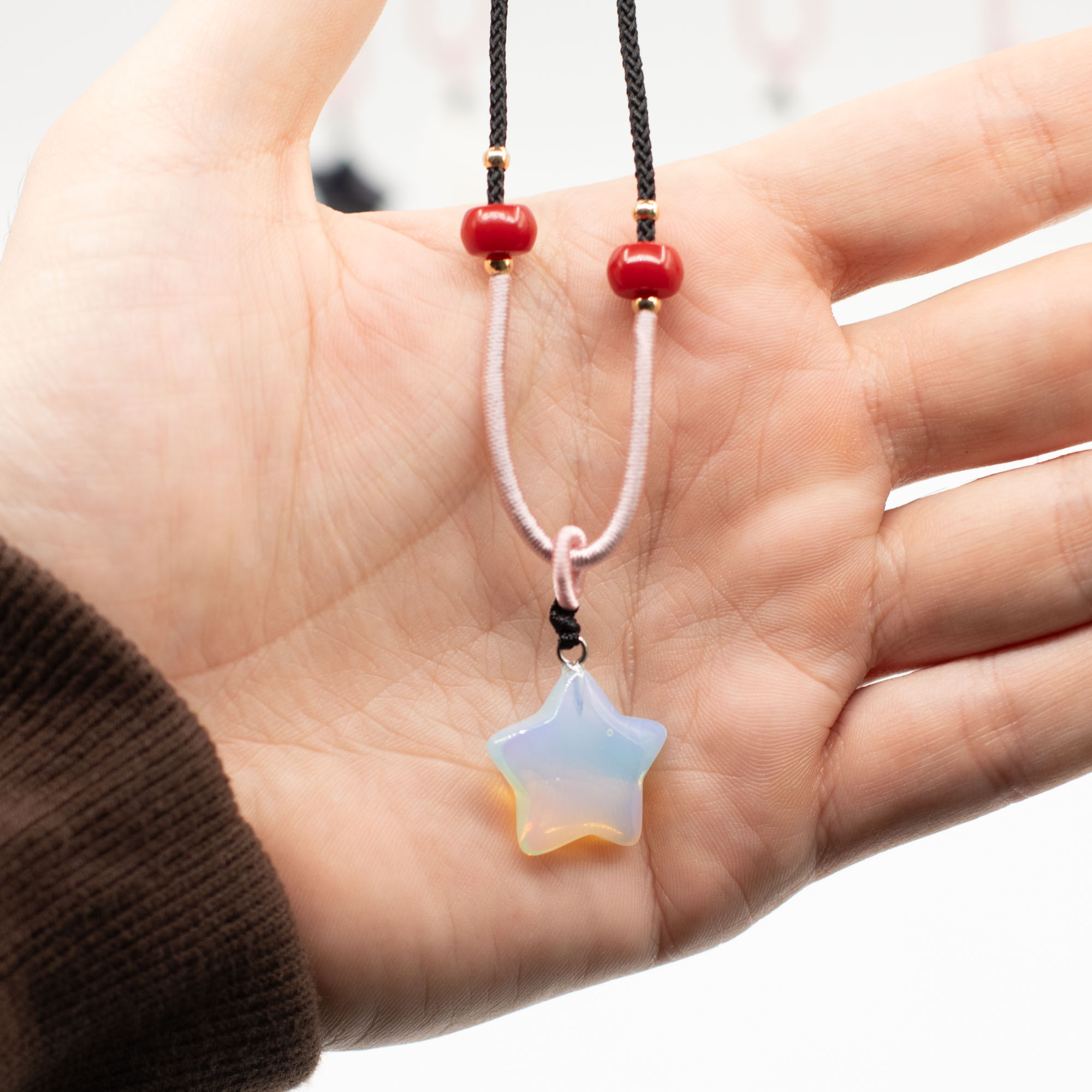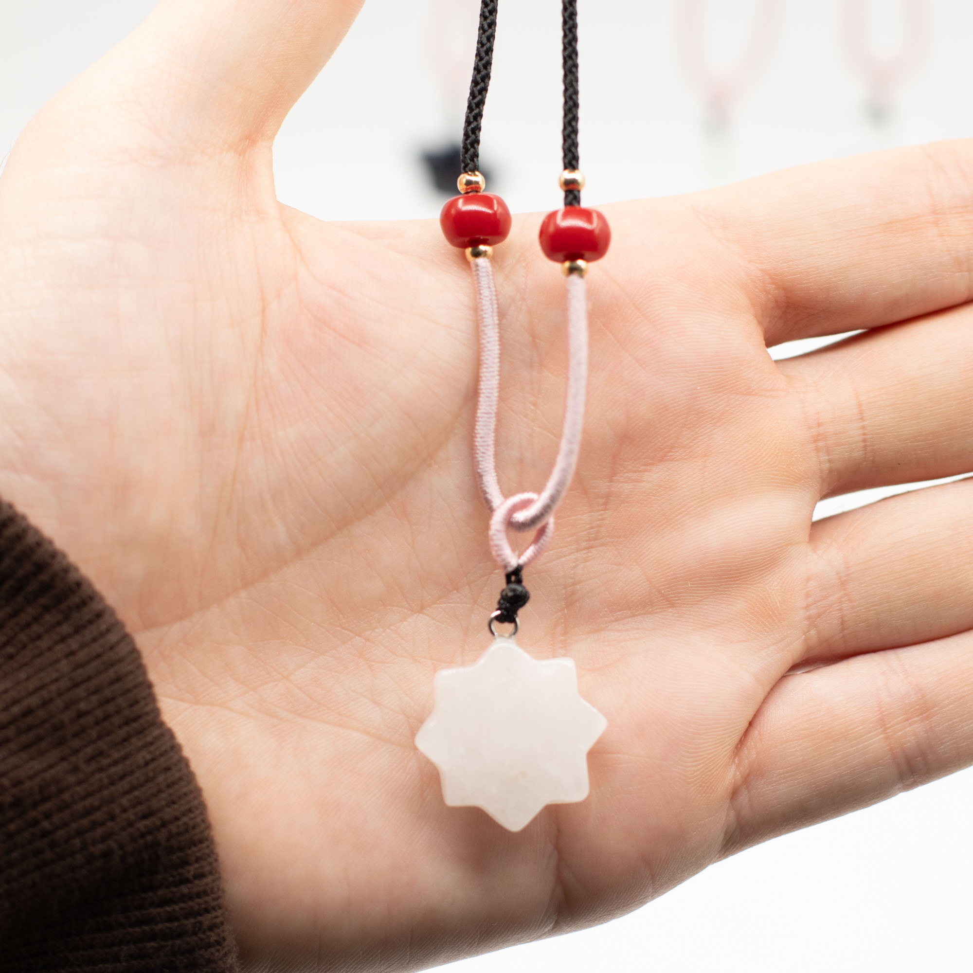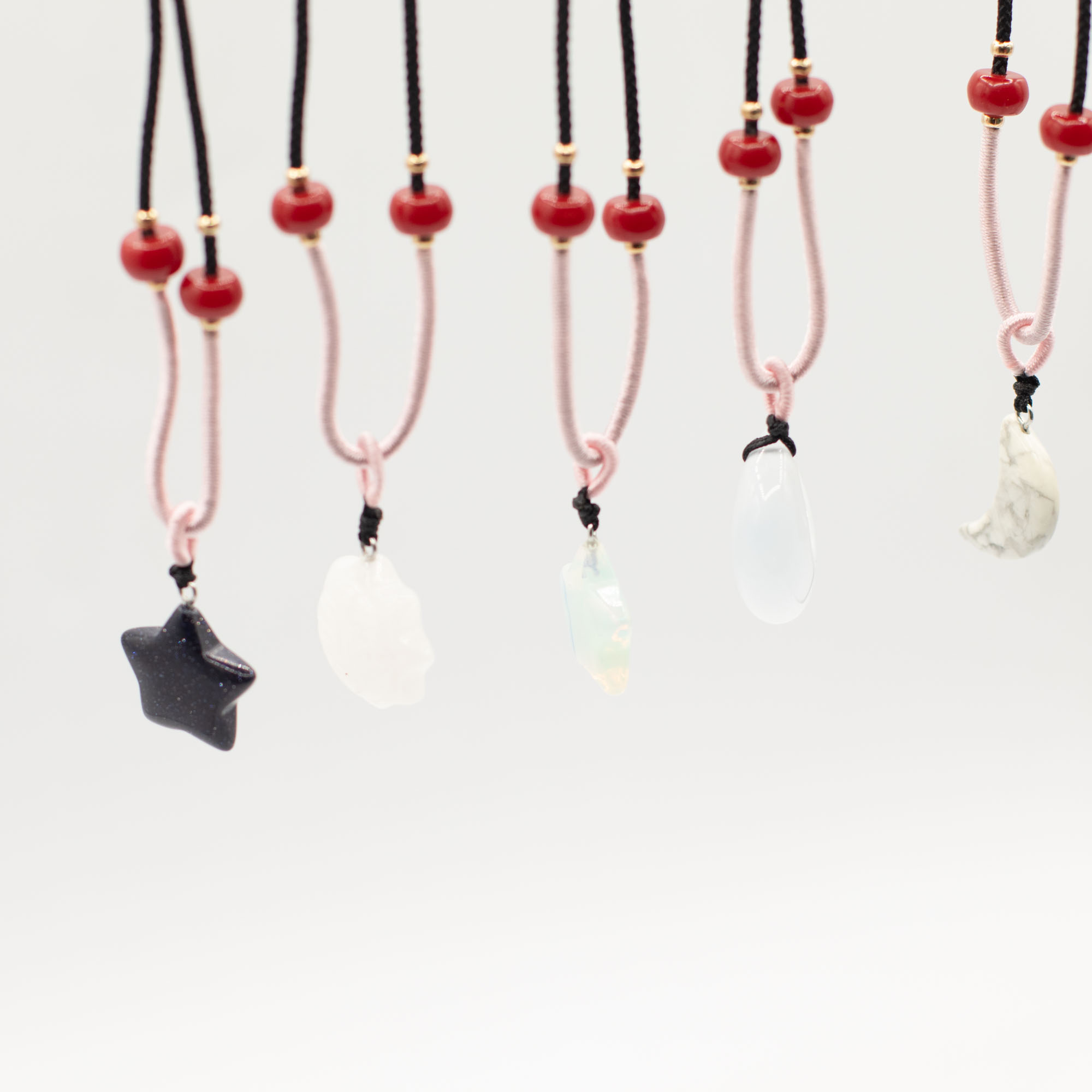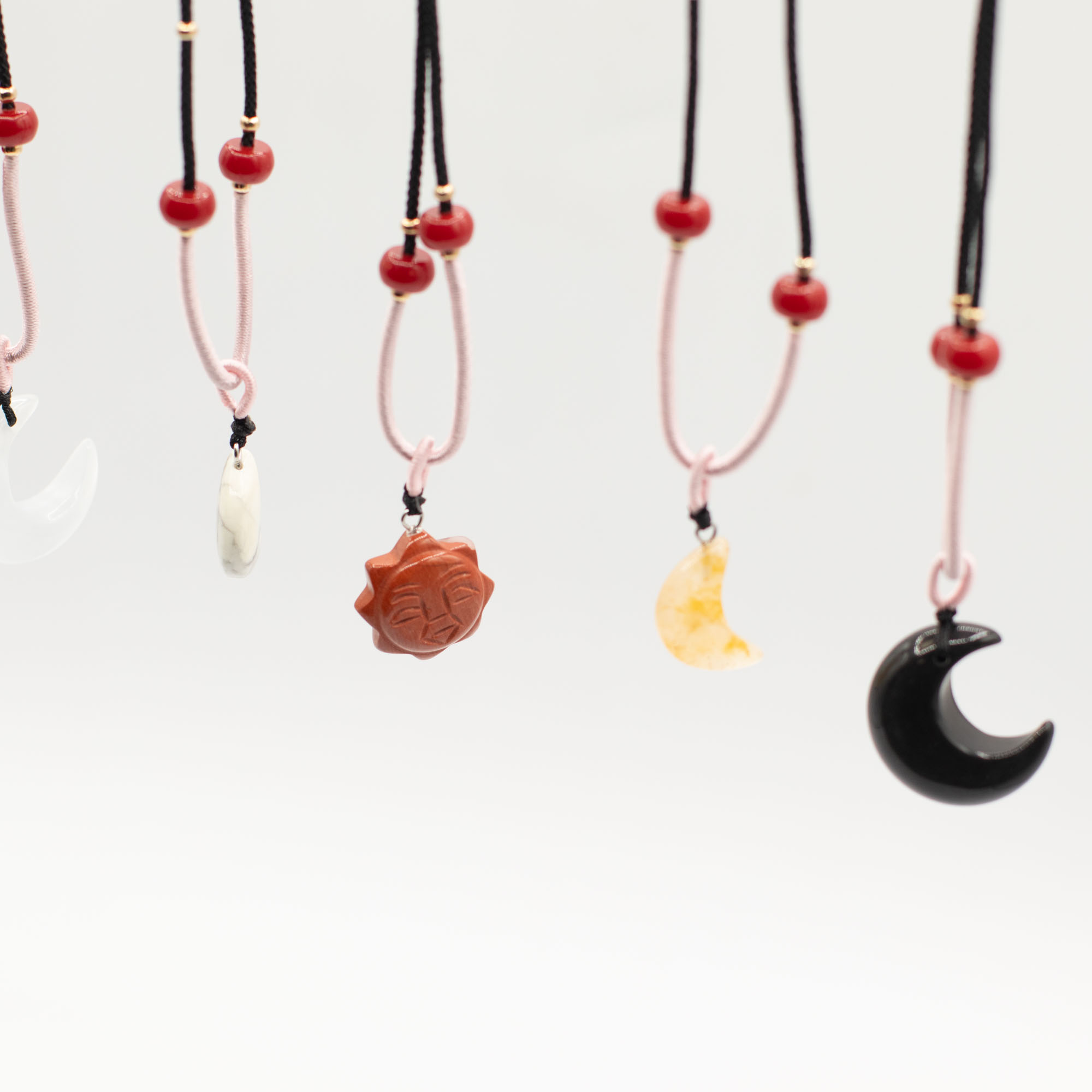 Die Kollektion umfasst eine Vielzahl beliebter himmlischer Motive wie Sonne, Mond und Sterne, gefertigt aus verschiedenen natürlichen Edelsteinen. Jeder Anhänger wird an einer verstellbaren Kordelhalskette mit dekorativen Perlendetails präsentiert, sodass ein sofort verkaufsbereites, optisch ansprechendes Schmuckstück entsteht.