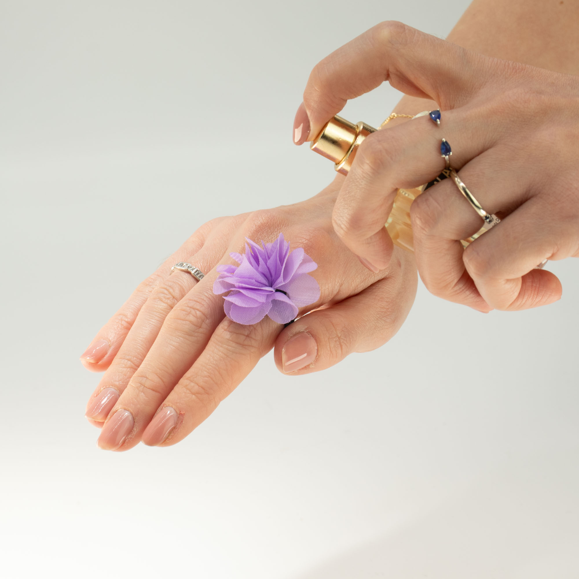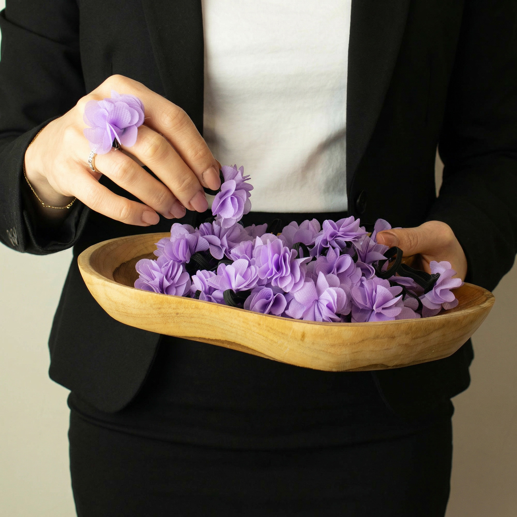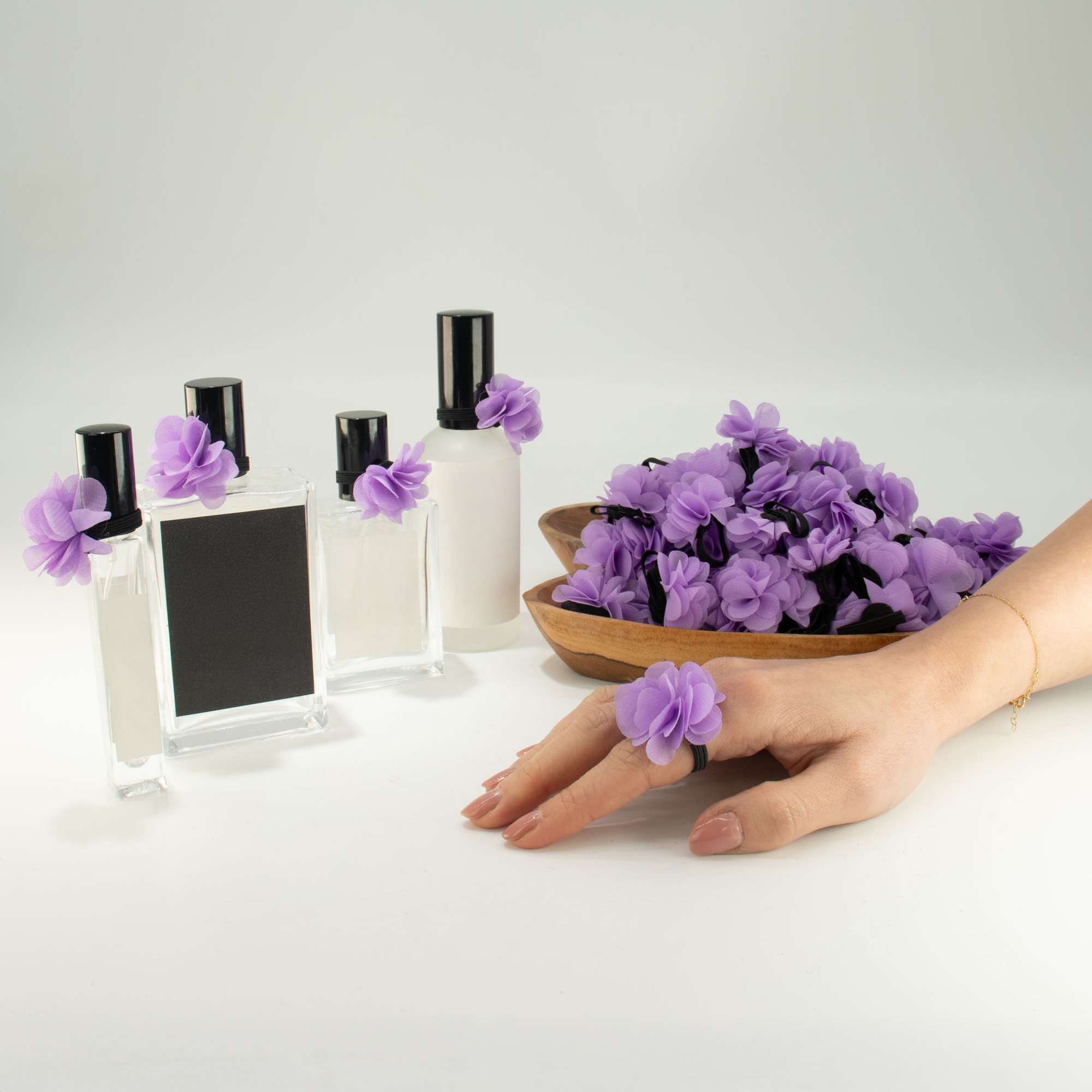 Diese Lavendel-Chiffon-Duftringe werden im Großhandel in 100er-Packungen geliefert und bieten eine sanfte, ansprechende Möglichkeit, Düfte Kunden näherzubringen. Jeder Ring verfügt über eine leichte Chiffon-Blume auf einem elastischen Band, die Duftöl oder Parfüm aufnimmt und den Duft beim Tragen langsam freisetzt.