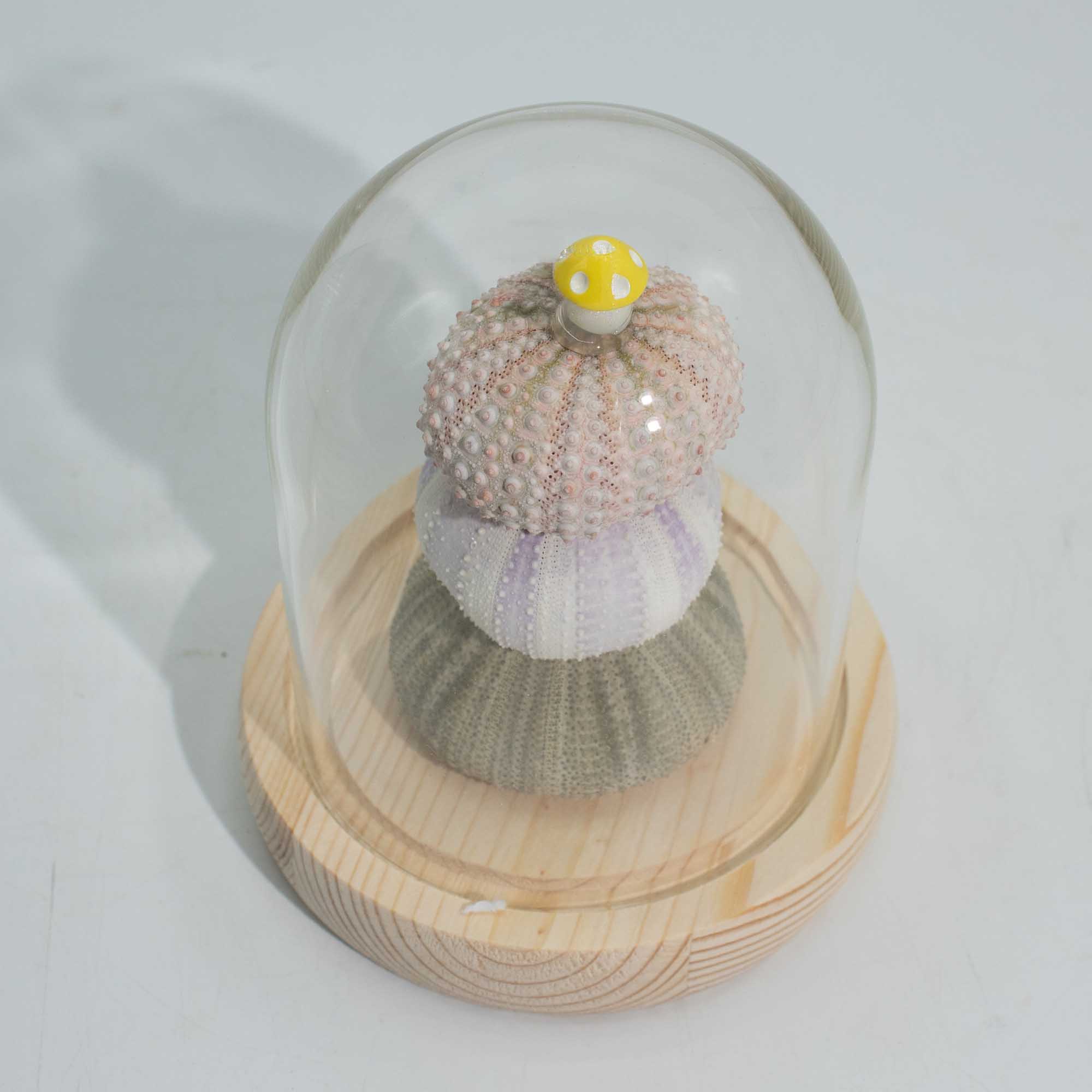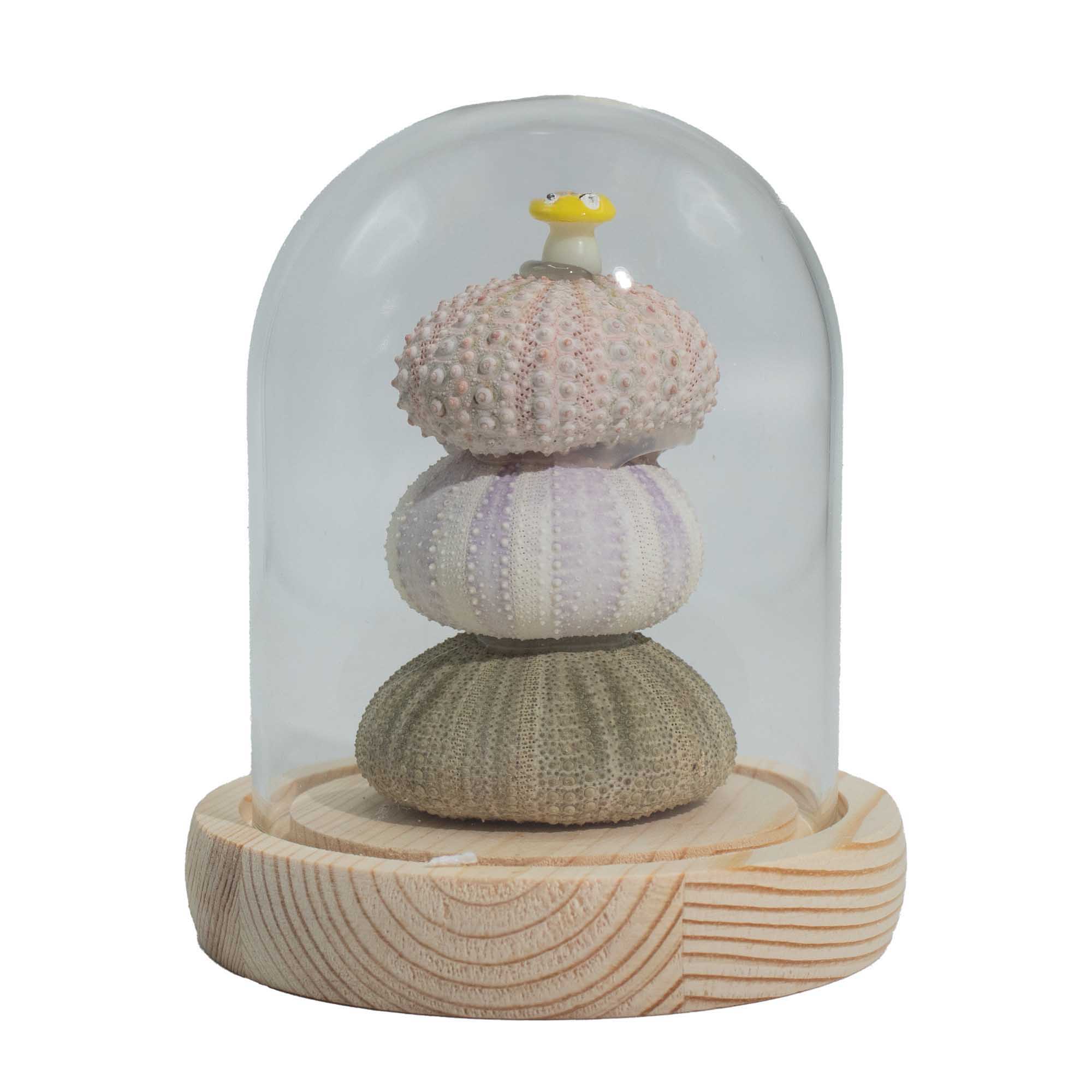 Die Blühende Leucht-Gartenkuppel – 3 Seeigel bringt ein skulpturales, designorientiertes Element in die Kollektion. Dieses Stück setzt weniger auf florale Motive, sondern legt den Fokus auf Form, Balance und Oberflächendetails. Die drei Seeigel-Formen sind unter einer klaren Glaskuppel gestapelt und schaffen einen kleinen skulpturalen Akzent, der durch Textur und Proportionen Aufmerksamkeit erzeugt, statt durch Farbe.