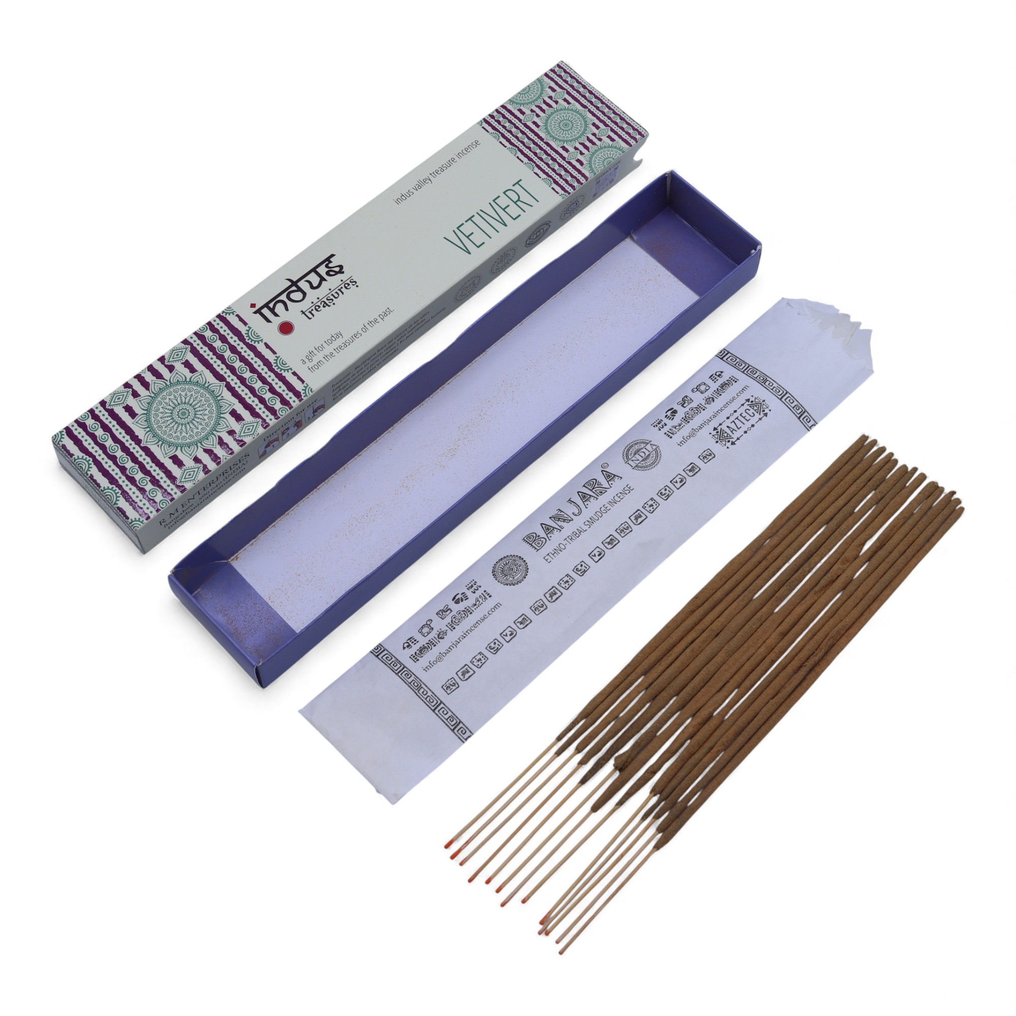 Indus Treasures Vetiver-Räucherstäbchen verströmen ein kühles, erdiges Aroma mit sanften Rauchnoten, das erdend und stabilisierend wirkt. Ein Duft, den Kunden wählen, wenn sie Fokus, Ruhe und stille Rituale suchen. Ideal für Wellness-Läden und spirituelle Einzelhändler, die Produkte für achtsames Leben anbieten.