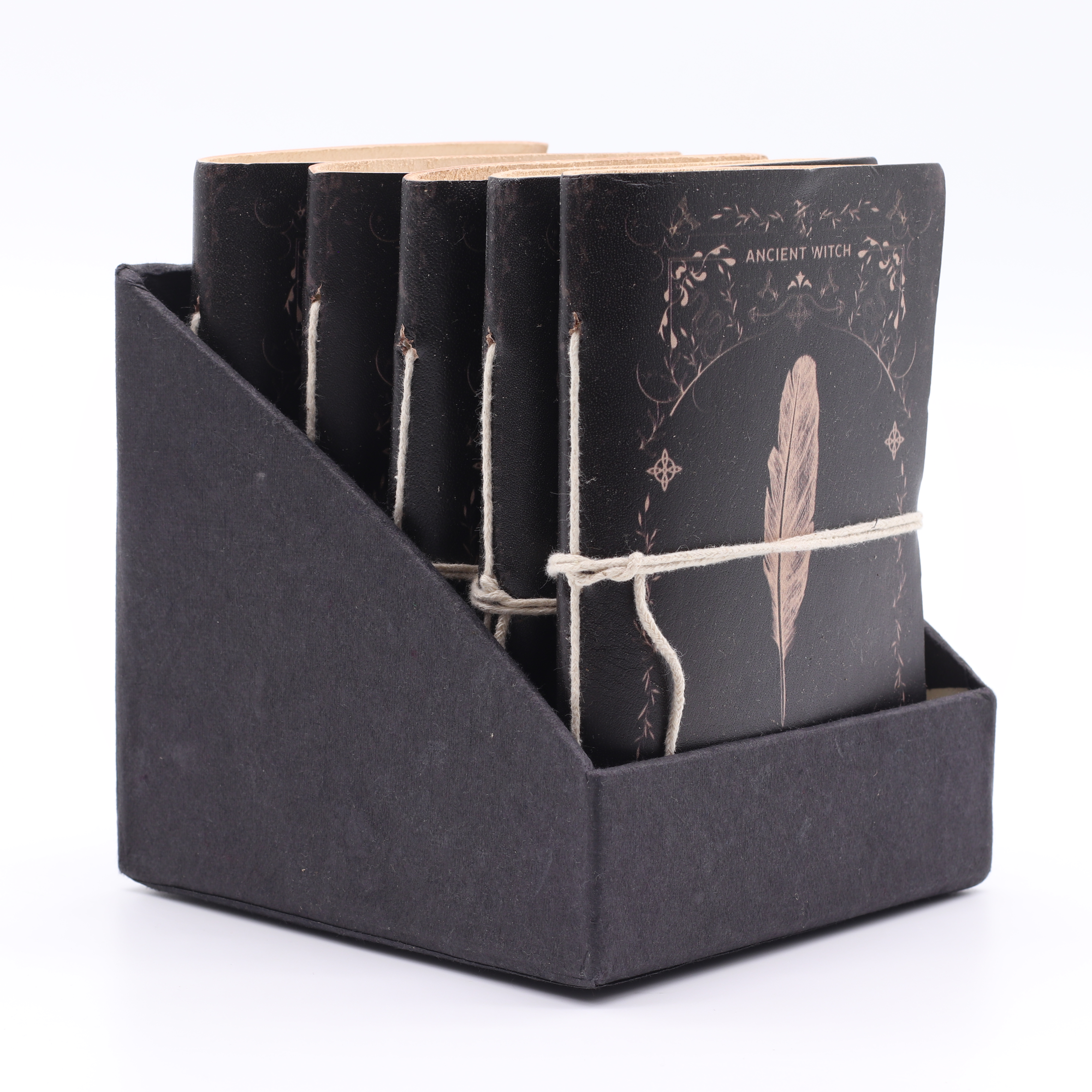 Jedes der 15,2 x 11,4 cm großen Notizbücher ist mit wunderschönen, rituellen und esoterischen Prägungen versehen, die an Mondphasen, Pentagramme und heilige Geometrie erinnern – Symbole, die seit Langem mit Schutz, Transformation und Balance in Verbindung gebracht werden. Die griffigen Ledereinbände und die Büttenränder verleihen den Notizbüchern ein authentisches „Grimoire“-Feeling und sprechen Kunden an, die sich für Hexerei, Heidentum oder mystische Ästhetik interessieren.