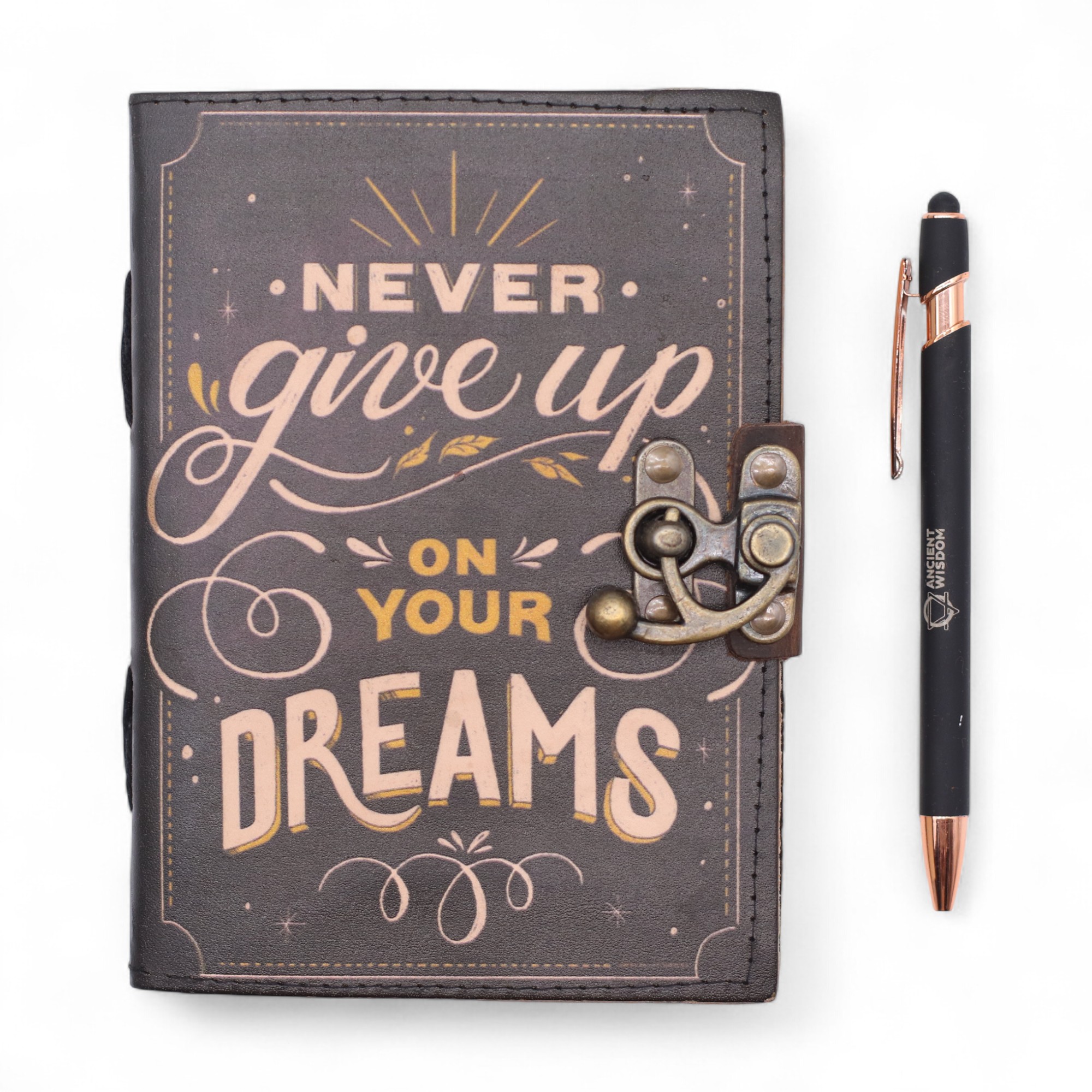 Auffällig, motivierend und modern – dieses bedruckte Notizbuch aus Leder vermittelt eine universelle Botschaft: „Gib deine Träume niemals auf.“