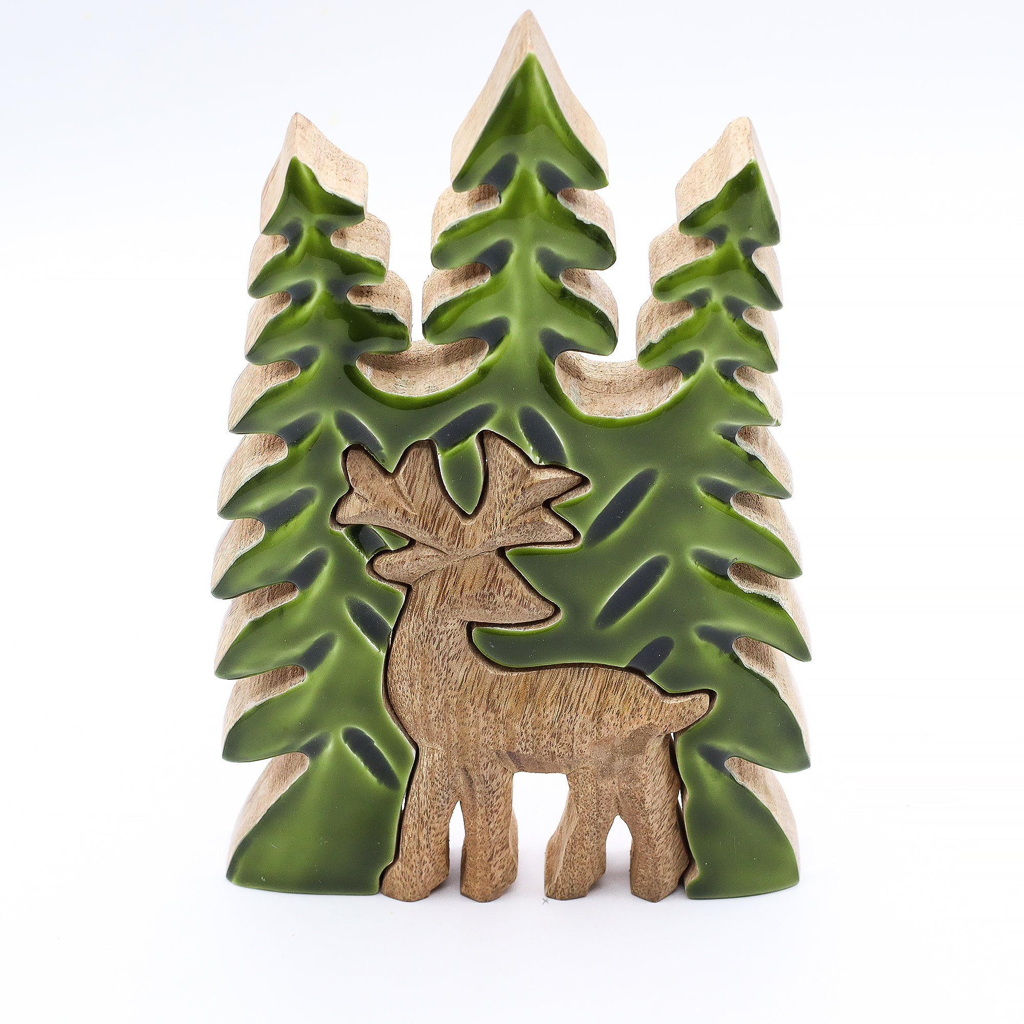Diese beeindruckende 3D-Holzdeko „Hirsch im Wald“ fängt die majestätische Schönheit des Waldes ein. Sie wurde in Indien aus nachhaltigem Mangoholz handgeschnitzt und zeigt einen markanten 3D-Hirsch in einer Waldszene. Mit ihrer edlen, glänzenden Emaille-Oberfläche verbindet sie rustikales Holz mit leuchtend grünen Details und bringt so die Ruhe der Natur in Ihr Zuhause. Dieses fair gehandelte und ethisch hergestellte Stück ist ein toller Blickfang für naturbezogene Ausstellungen oder ein besonderes Geschenk. Es eignet sich auch hervorragend als wunderschöne Weihnachtsdekoration.
