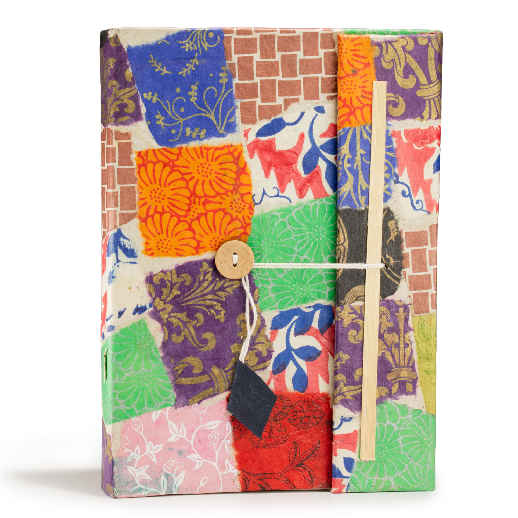 Dieses Patchwork-Lokta-Notizbuch ist darauf ausgelegt, visuell ausdrucksstark und bewusst unregelmäßig zu wirken. Das Cover besteht aus einzeln gemusterten Papierstücken, die übereinander gelegt eine lebendige, collageartige Oberfläche bilden, sodass kein Notizbuch dem anderen gleicht.