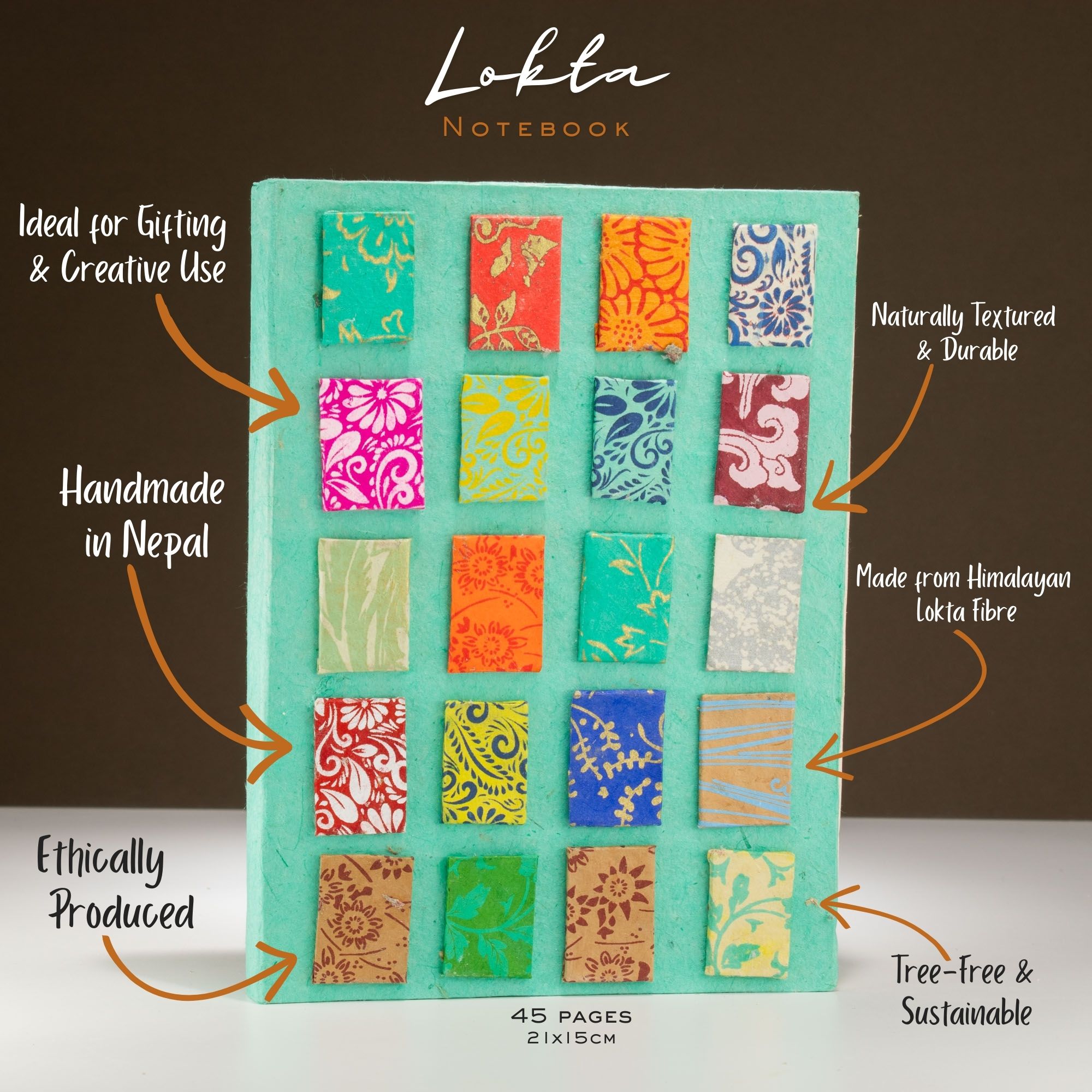 Dieses Mini-Tiles-Lokta-Notizbuch setzt auf Muster statt auf florale Motive und verwendet ein Raster aus einzeln dekorierten Papierflächen, das ein rhythmisches, fast mosaikartiges Cover erzeugt. Vor einem petrolfarbenen Hintergrund bringt jede Kachel ihre eigene Farbe und ihr eigenes Motiv ein, wodurch das Notizbuch eine verspielte, aber ausgewogene visuelle Identität erhält.