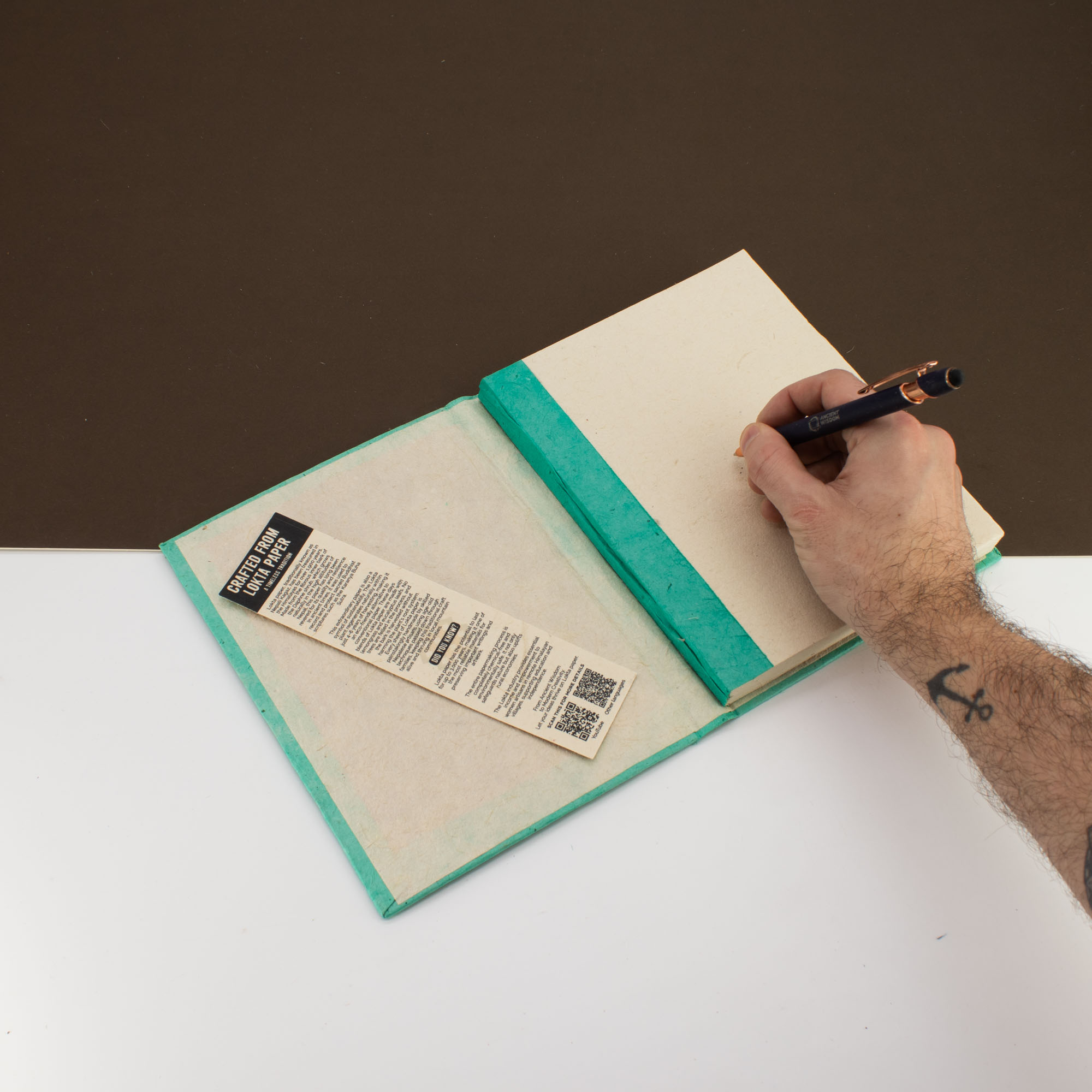 Im Inneren bieten 45 handgefertigte Seiten viel Platz zum Schreiben, Skizzieren oder Planen. Das größere Format eignet sich sowohl für kreative als auch für alltägliche Nutzung. Das Design lädt zum Anfassen und Entdecken ein und macht das Notizbuch im Laden leicht zum Blickfang.