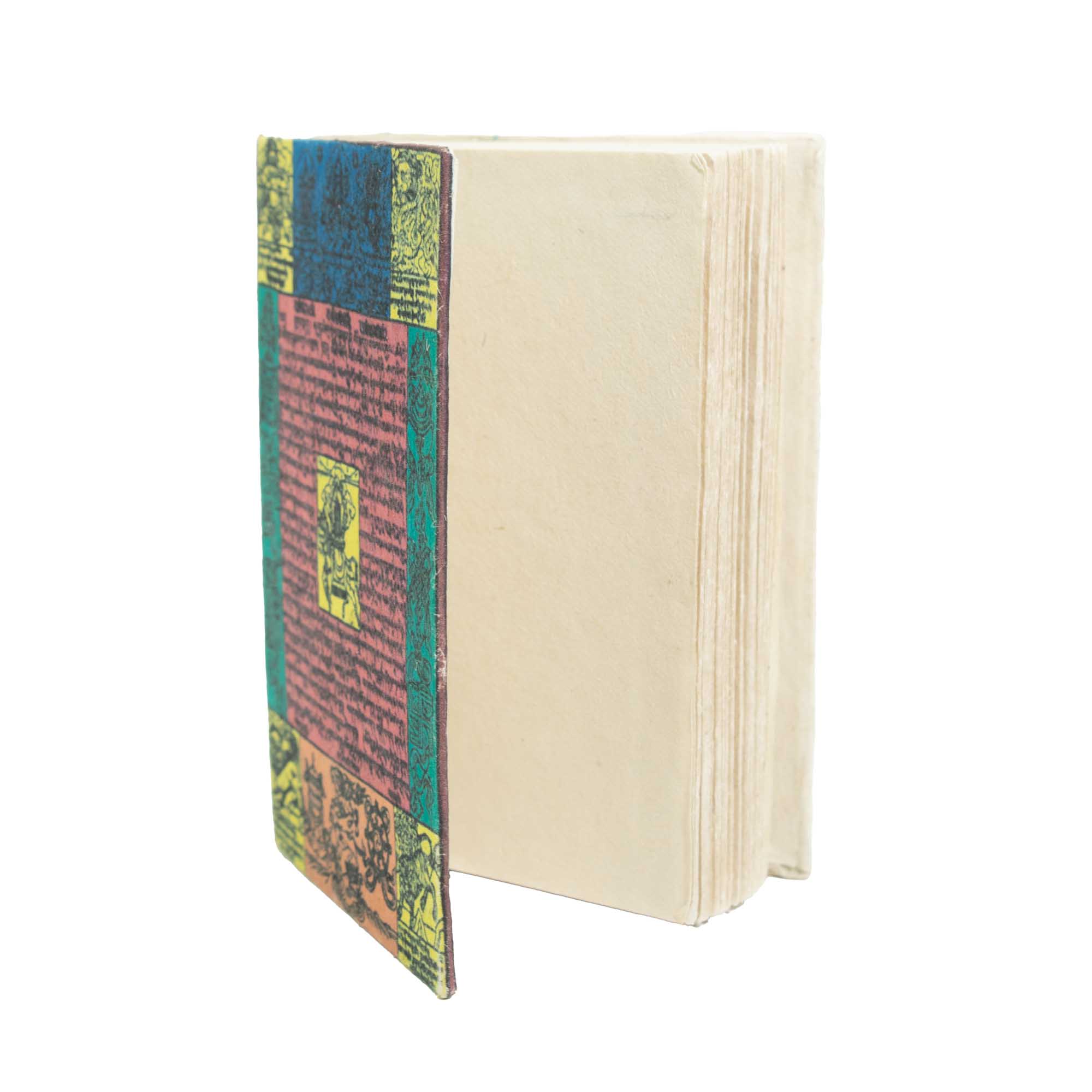 Inspiriert von traditionellen Himalaya-Gebetsfahnen trägt dieses Lokta-Notizbuch symbolische Motive und schriftartige Details, die ihm eine starke kulturelle Identität verleihen. Die übereinanderliegenden Flächen und kontrastierenden Farben erzeugen einen gerahmten Effekt, wodurch das Cover klar strukturiert und bewusst gestaltet wirkt – nicht rein dekorativ.