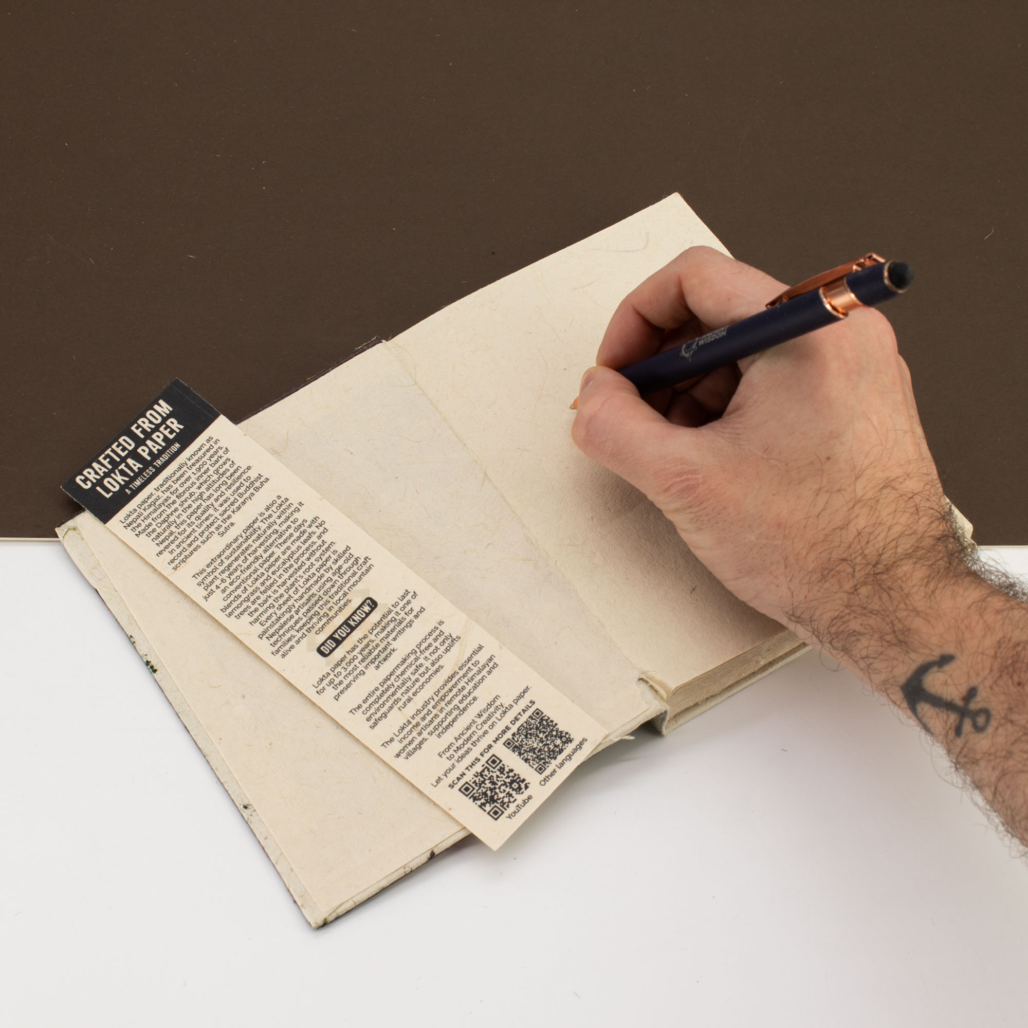 In Nepal in Handarbeit aus authentischem Lokta-Papier gefertigt, besitzt das Notizbuch eine natürlich faserige Oberfläche, die seine Herkunft und handwerklichen Wurzeln unterstreicht. Das mittlere Format macht es praktisch und zugänglich und spricht Kund:innen an, die Bedeutung und Handwerkskunst höher schätzen als kurzlebige Trends.