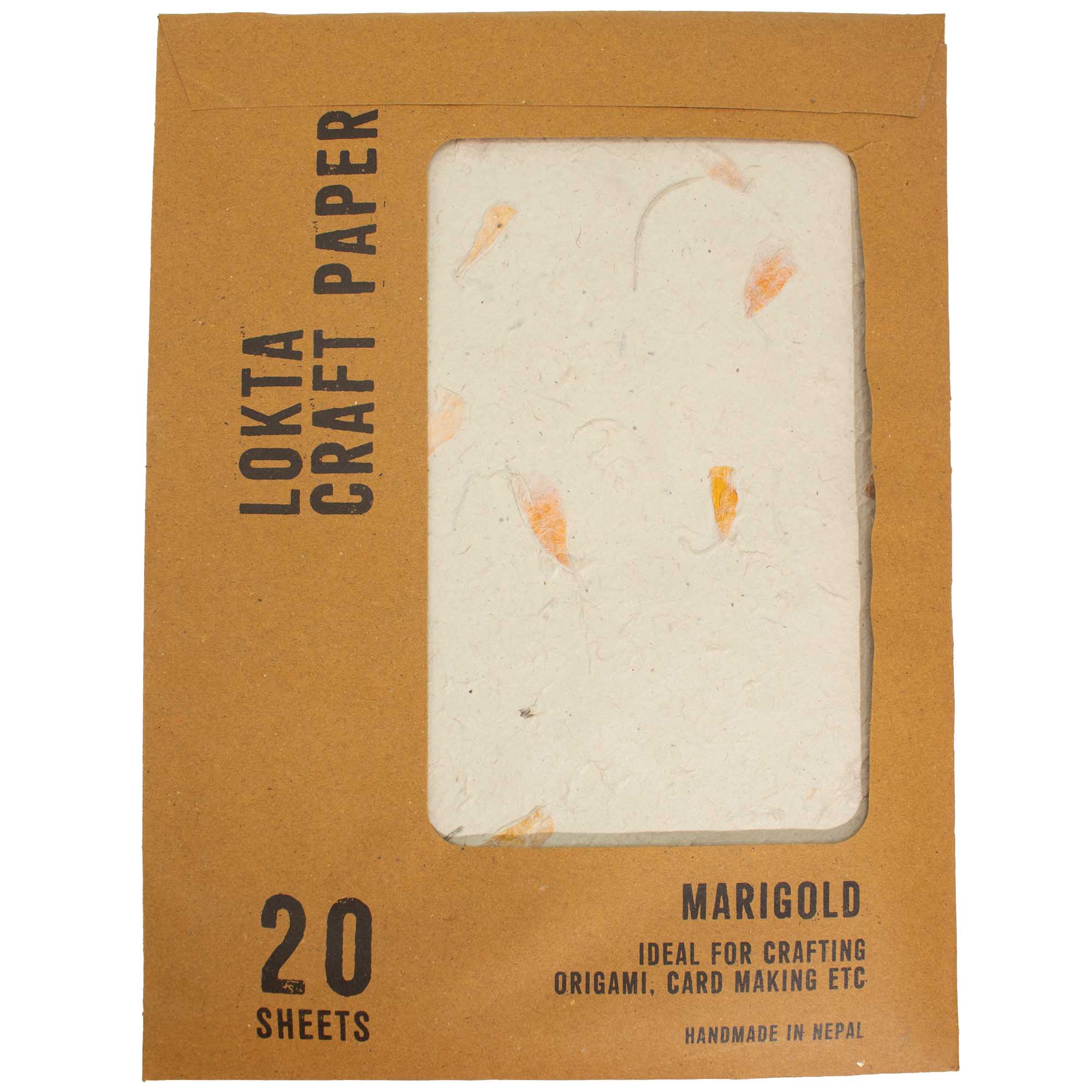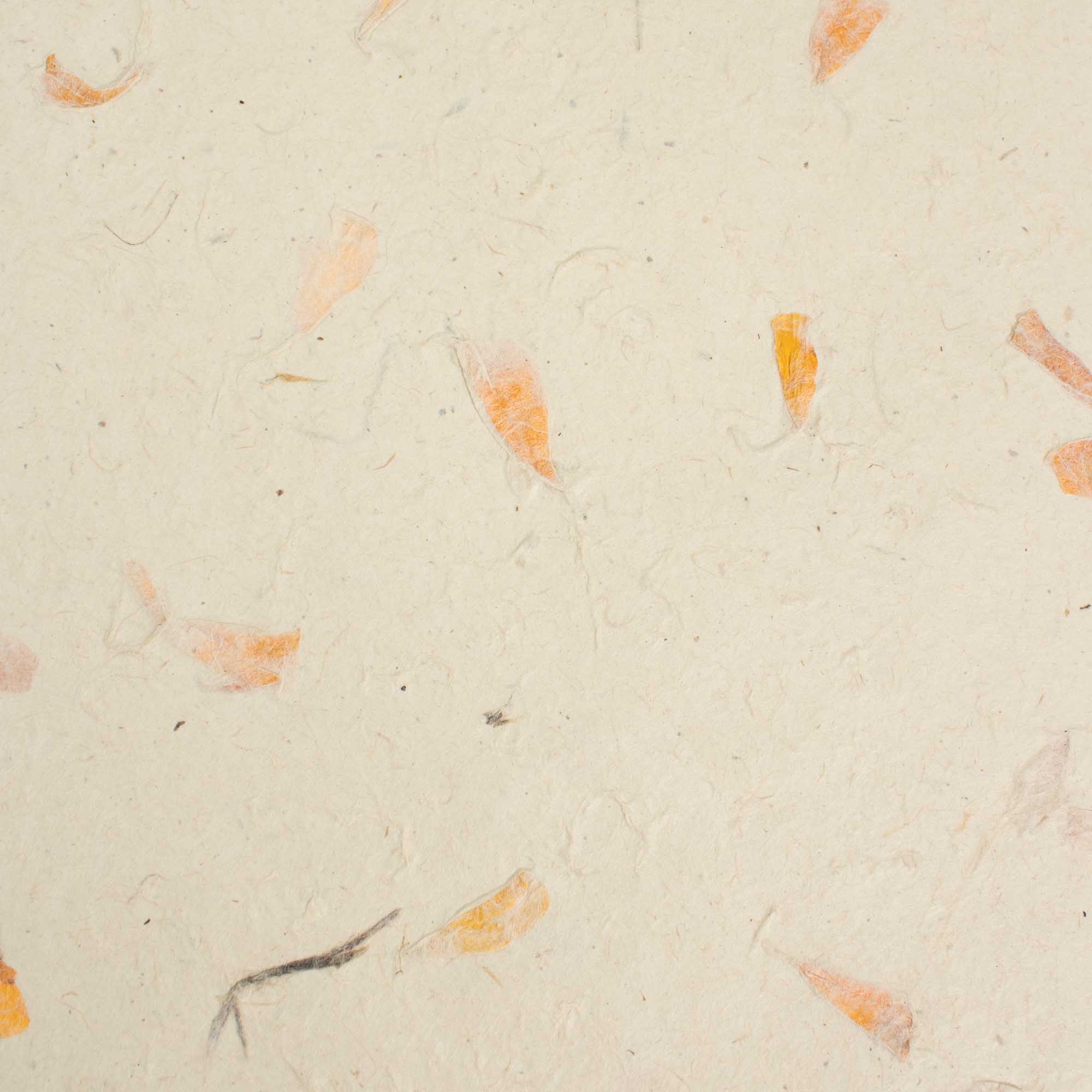 Handgefertigtes A4-Lokta-Bastelpapier mit natürlichen Ringelblumenblüten, die direkt in jedes Blatt eingearbeitet sind. Hergestellt in Nepal nach traditionellen Methoden, wird dieses Papier aus der faserigen Rinde der Lokta-Pflanze gefertigt, die für ihre Stärke, Textur und Langlebigkeit bekannt ist.