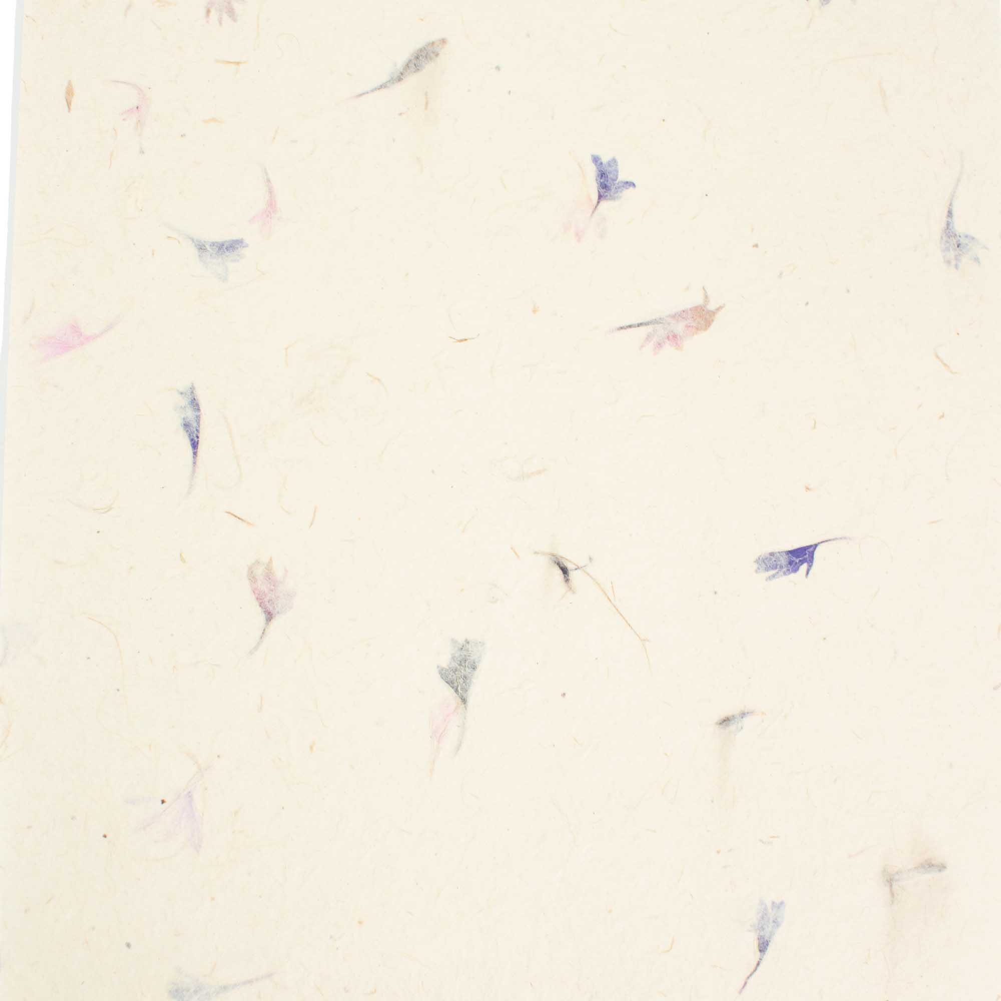 Handgefertigtes A4-Lokta-Bastelpapier mit zarten Kornblumenblüten, die natürlich in jedes Blatt eingearbeitet sind. Hergestellt in Nepal nach traditionellen Techniken wird dieses Papier aus der Rinde der Lokta-Pflanze gefertigt, die für ihre Langlebigkeit, ihre besondere Textur und ihren nachhaltigen Ursprung geschätzt wird.