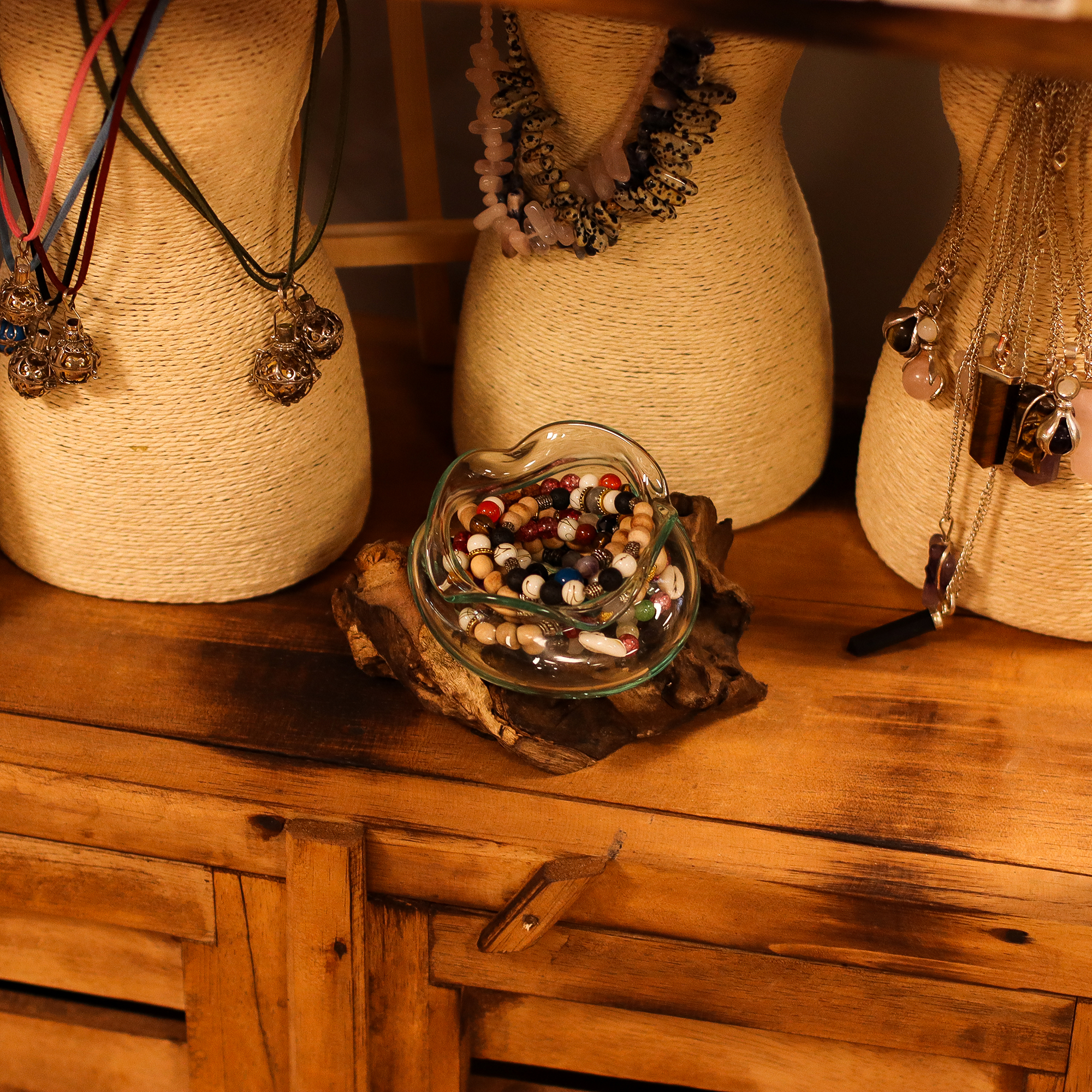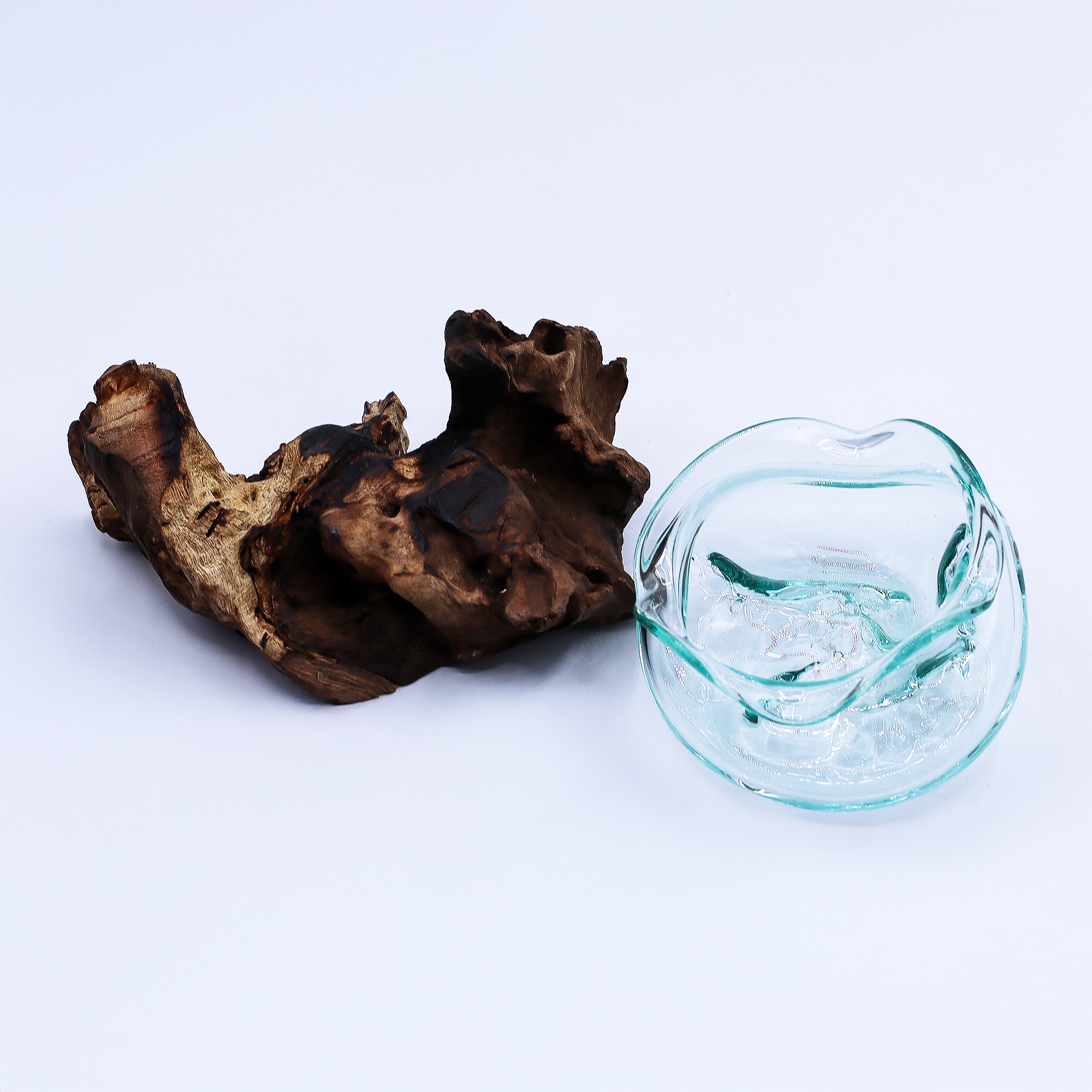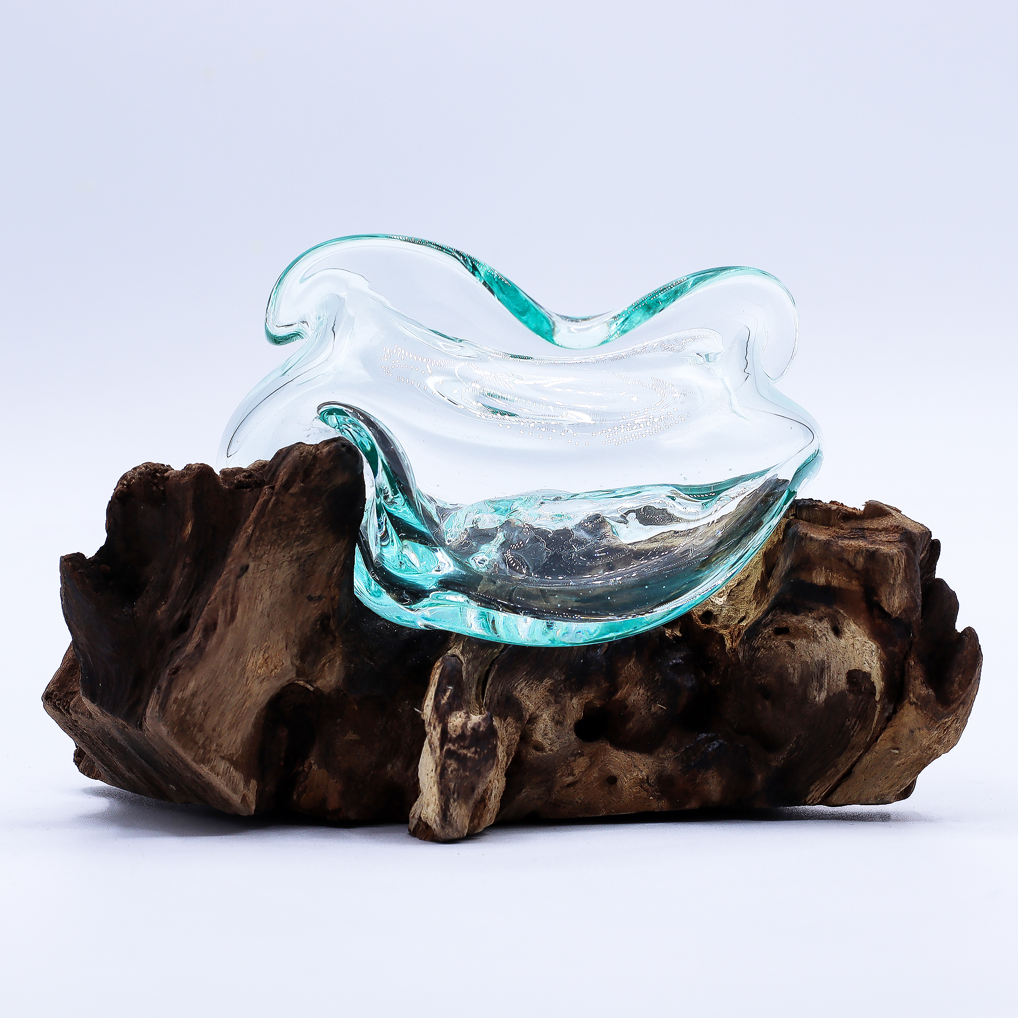 Das geschmolzene Glas wird direkt über dem Holz geformt, wodurch elegante Wellen und organische Kurven entstehen, die sich nahtlos mit der Basis verbinden. Das skulpturale Design lädt zu vielseitiger Präsentation ein – perfekt für Teelichter, schwimmende Blumen, Muscheln oder Edelsteine.