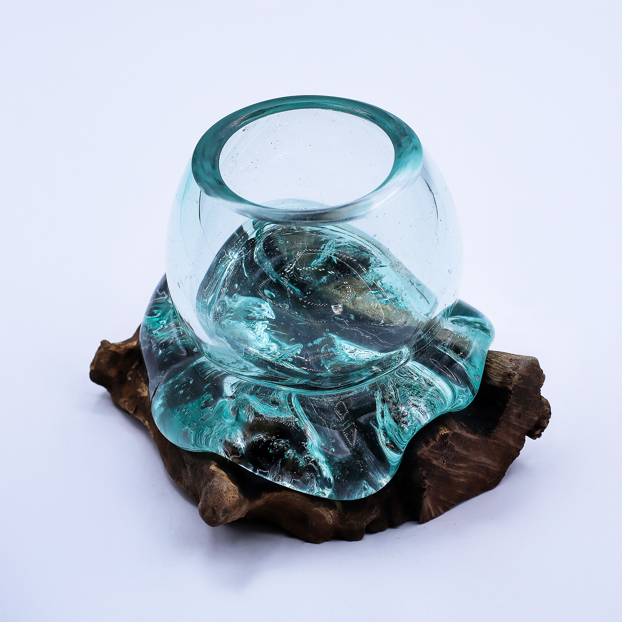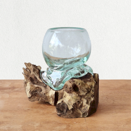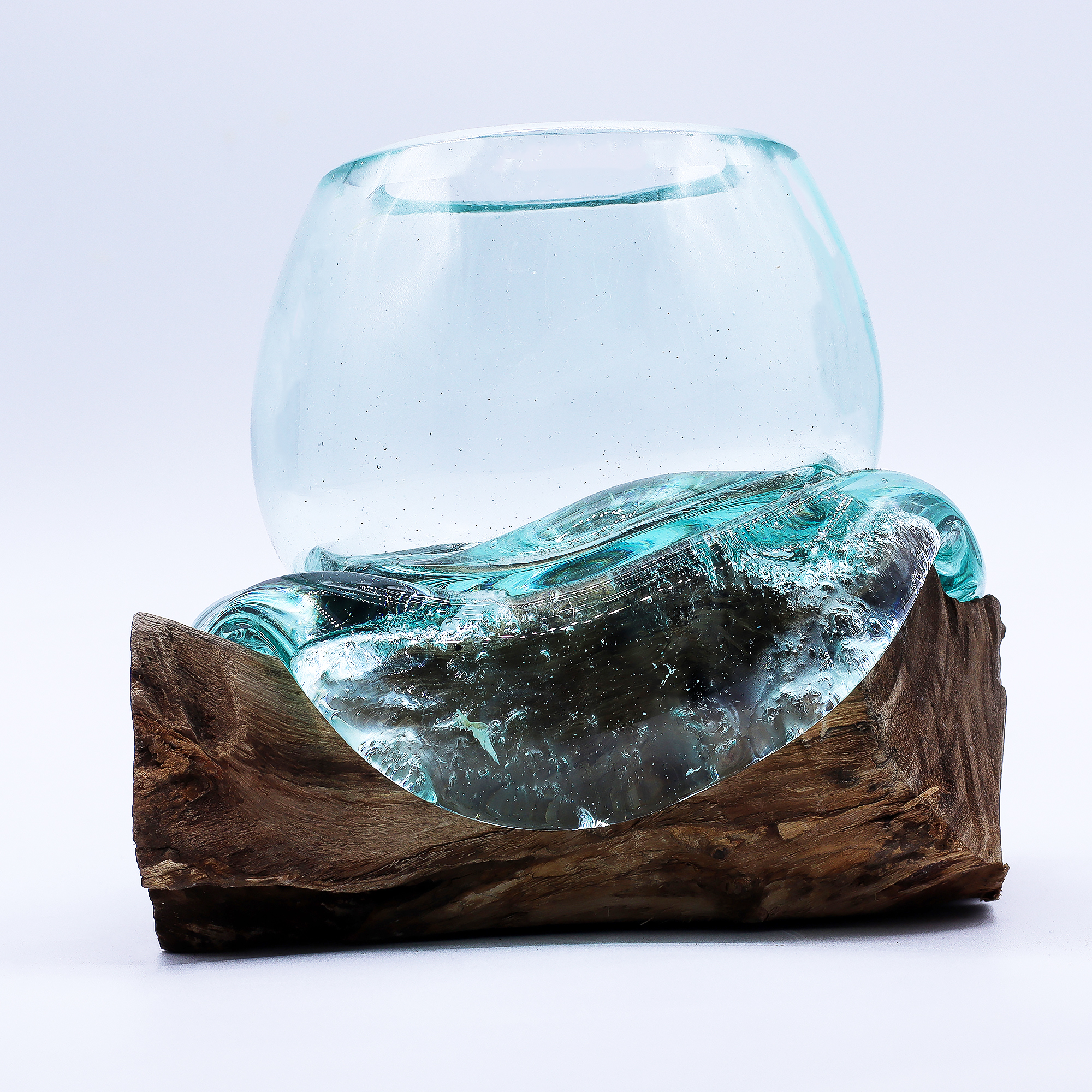 Hergestellt auf Bali aus recyceltem Glas und nachhaltig gewonnenem Gamal-Holz, wird jedes Stück individuell geformt, indem heißes Glas über Naturholz gegossen wird, wodurch ein organischer, perfekt passender Sockel entsteht. Das Ergebnis ist eine wunderschöne, einzigartige Skulptur, die gleichzeitig als praktische Schale dient.