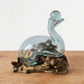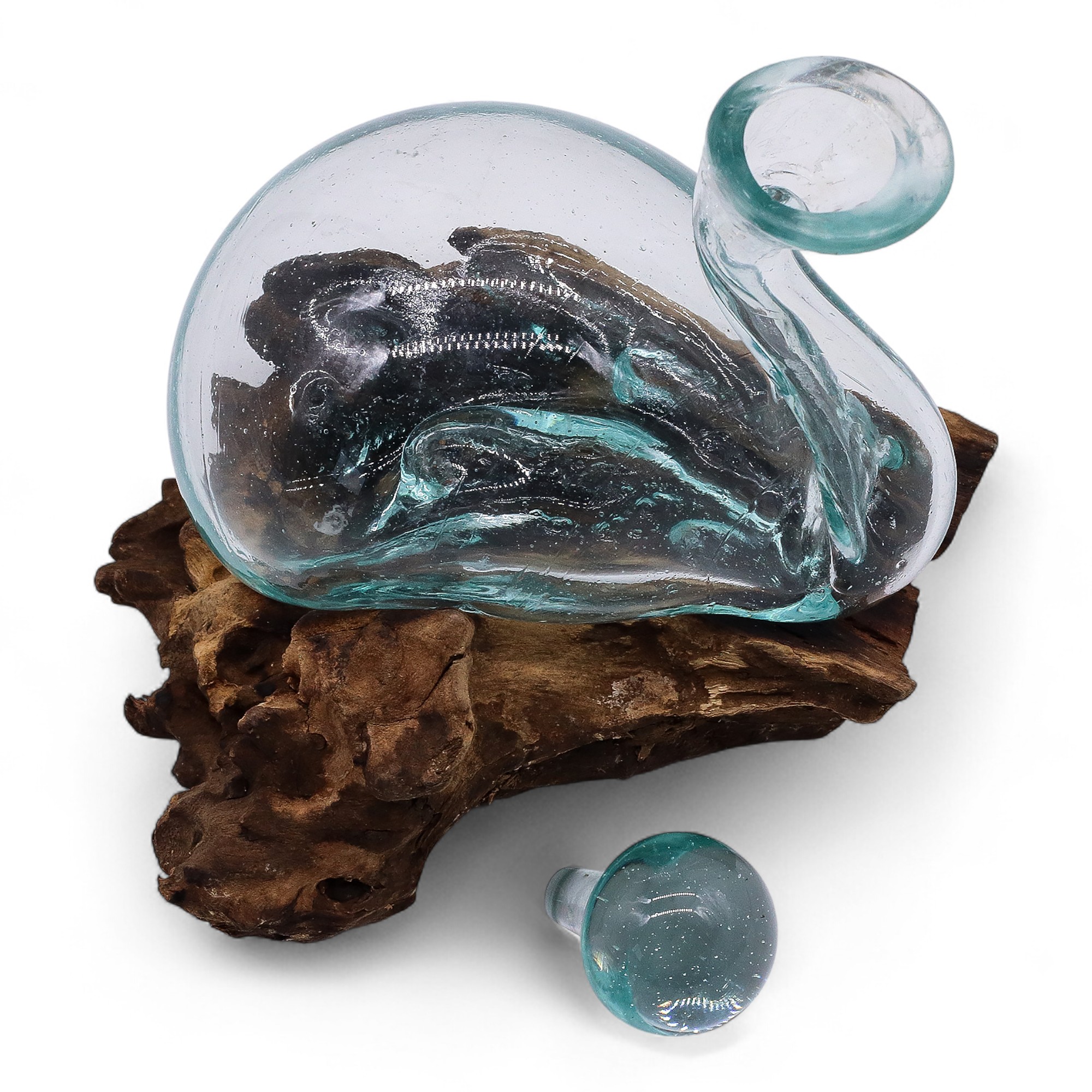 Handgefertigt auf Bali: Geschmolzenes Recyclingglas wird über Naturholz gegossen und bildet beim Abkühlen eine sichere, organische Basis. Mit passendem Glasverschluss ist sie praktisch und dekorativ zugleich.