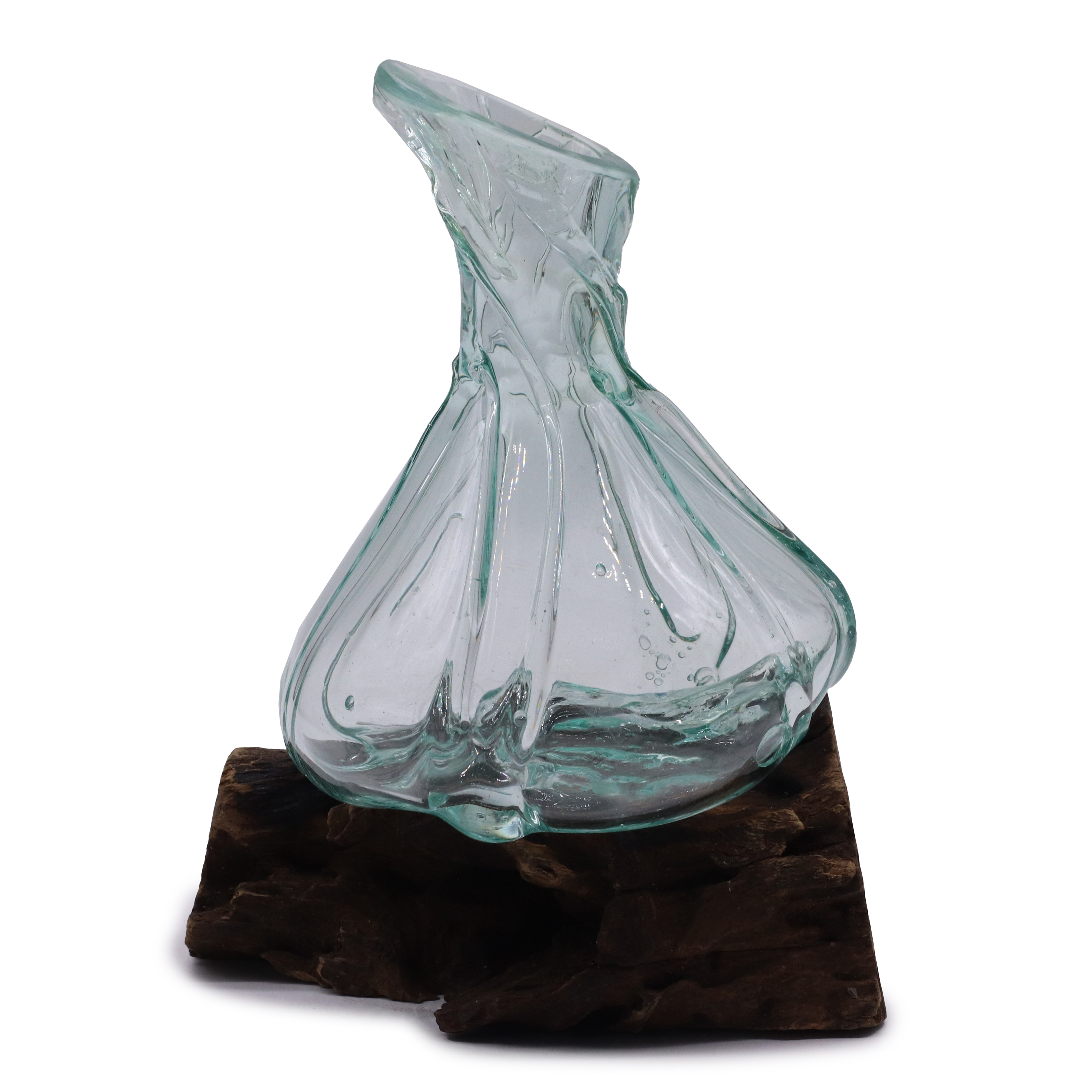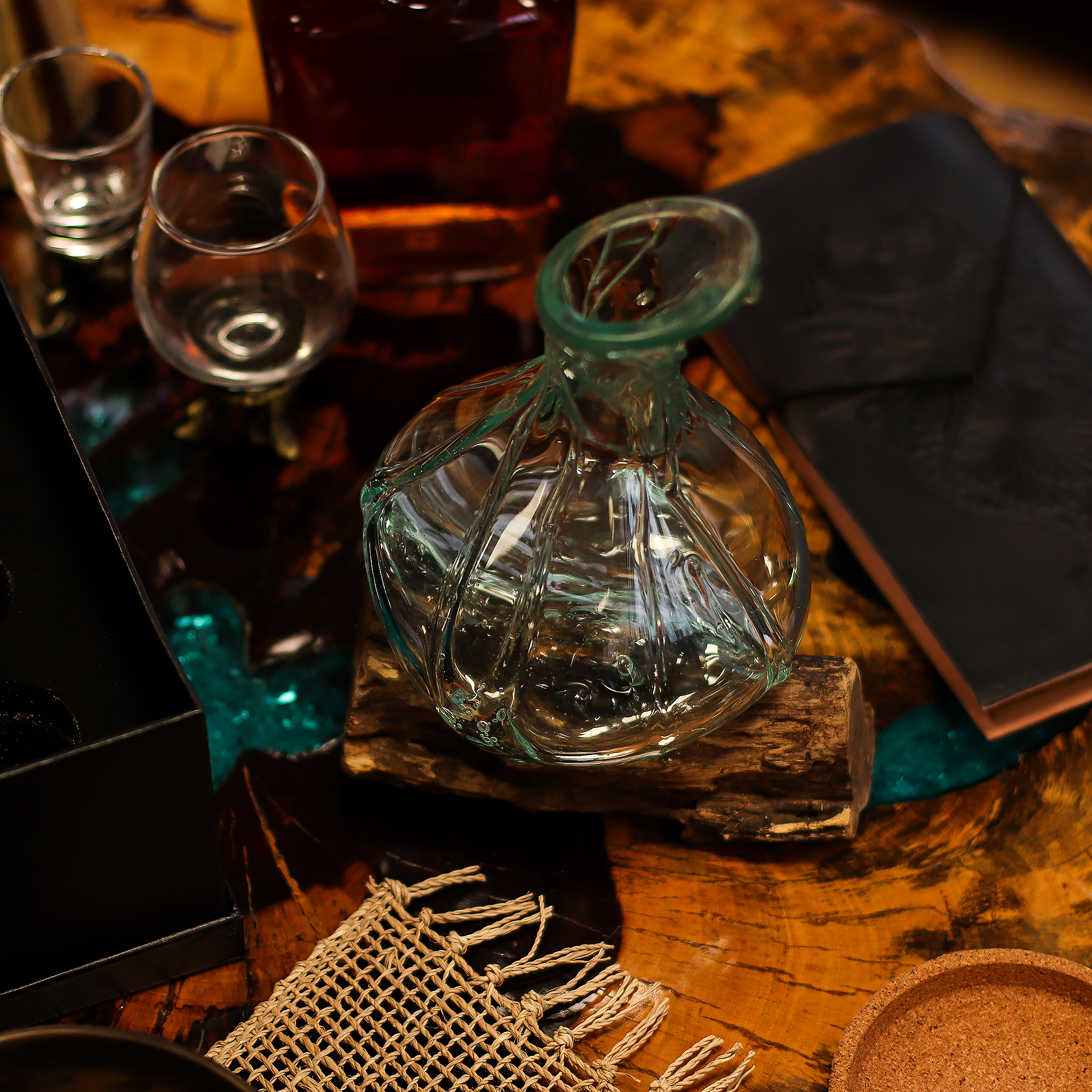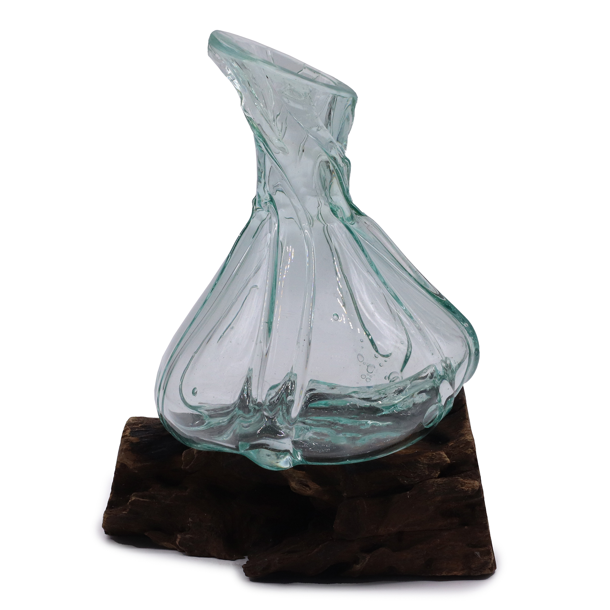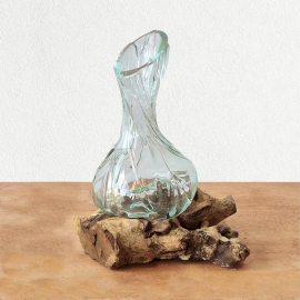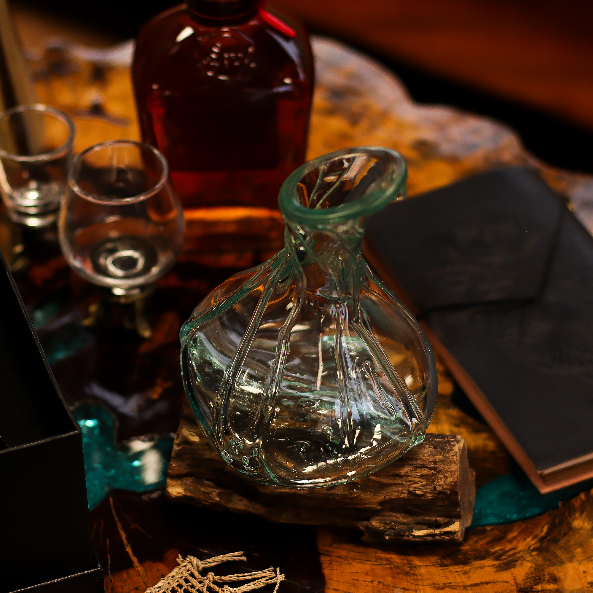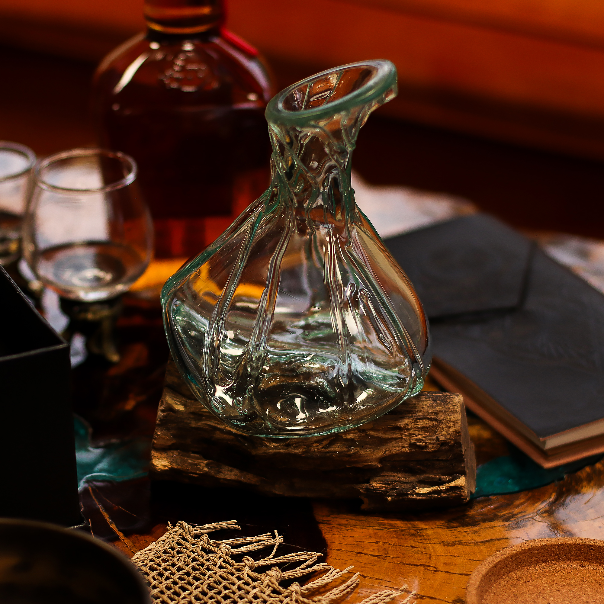 Jede Karaffe ist aus recyceltem Glas mundgeblasen und ruht elegant auf einem Sockel aus Naturholz, der beim Abkühlen des Glases geformt wird, um eine perfekte Passform zu gewährleisten. Die elegante Silhouette und die organische Textur machen sie ideal als funktionale Wein- oder Wasserkaraffe oder als reines Dekorationsobjekt.