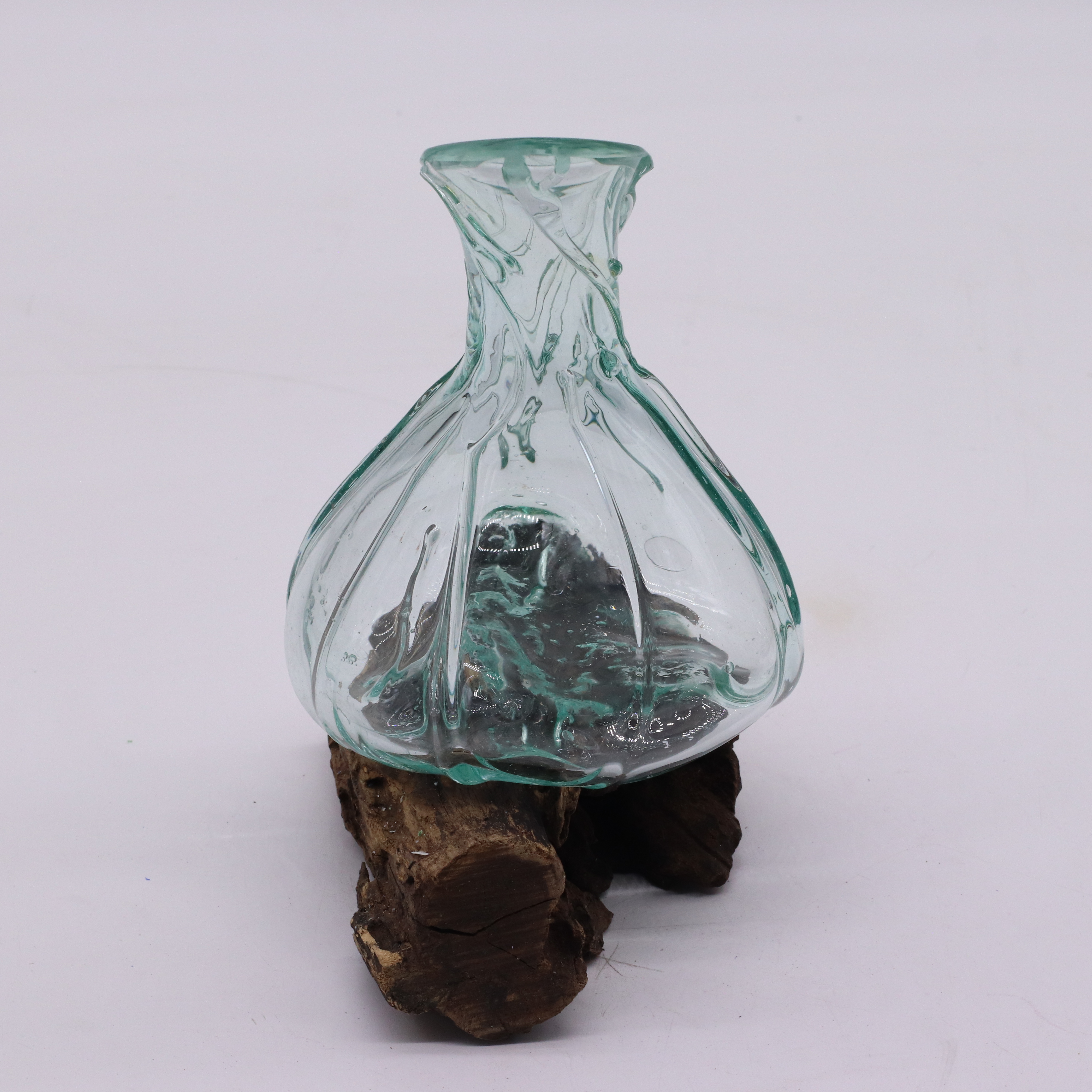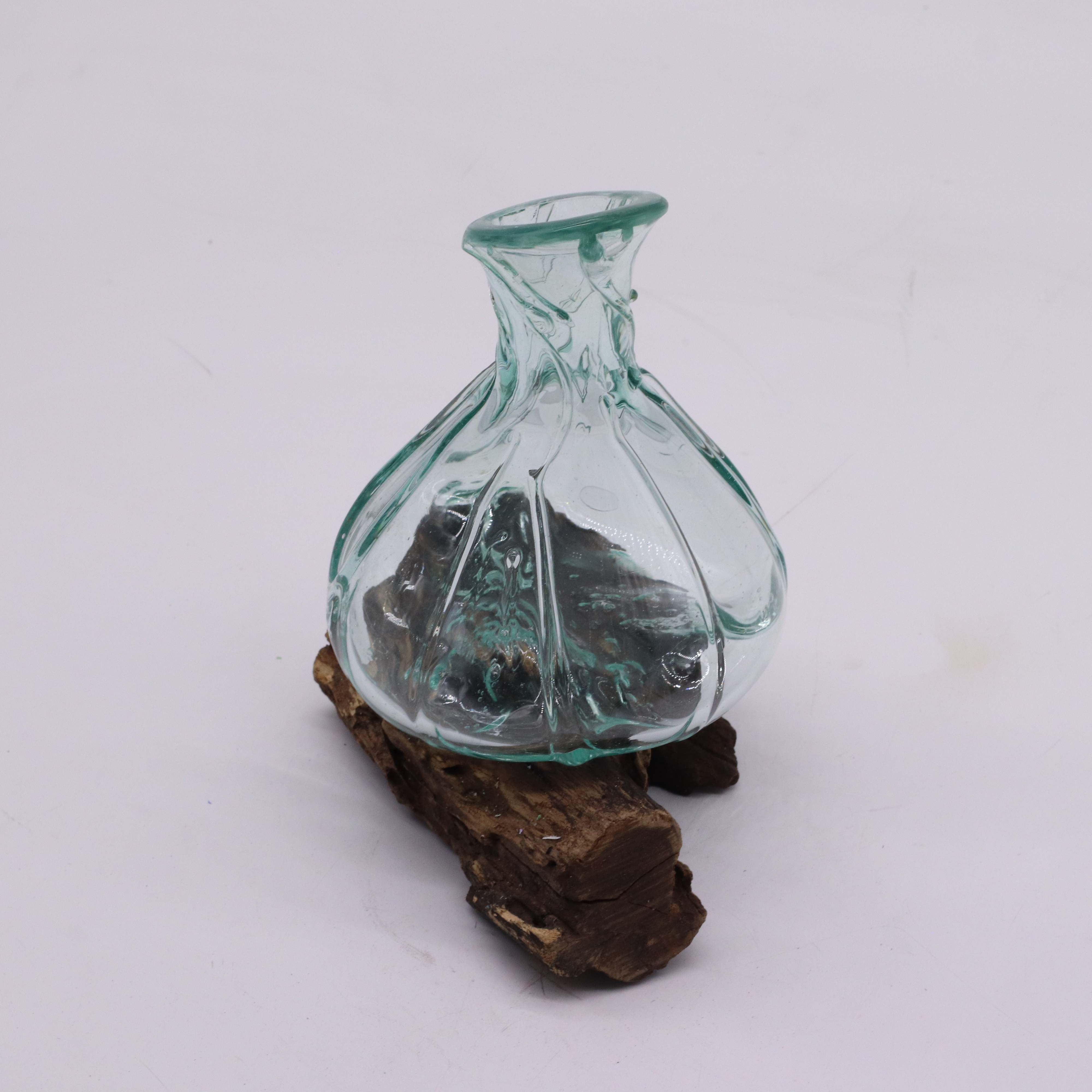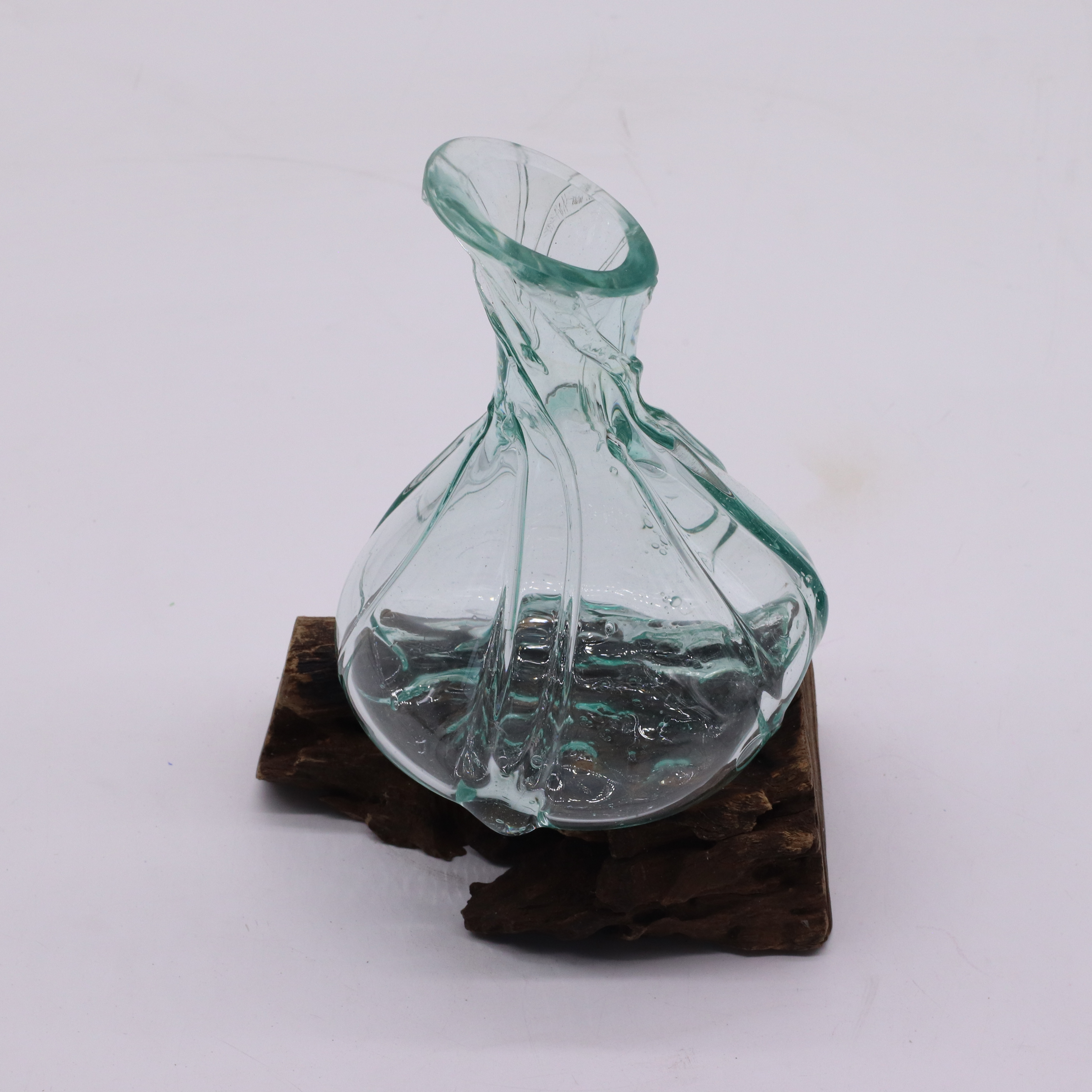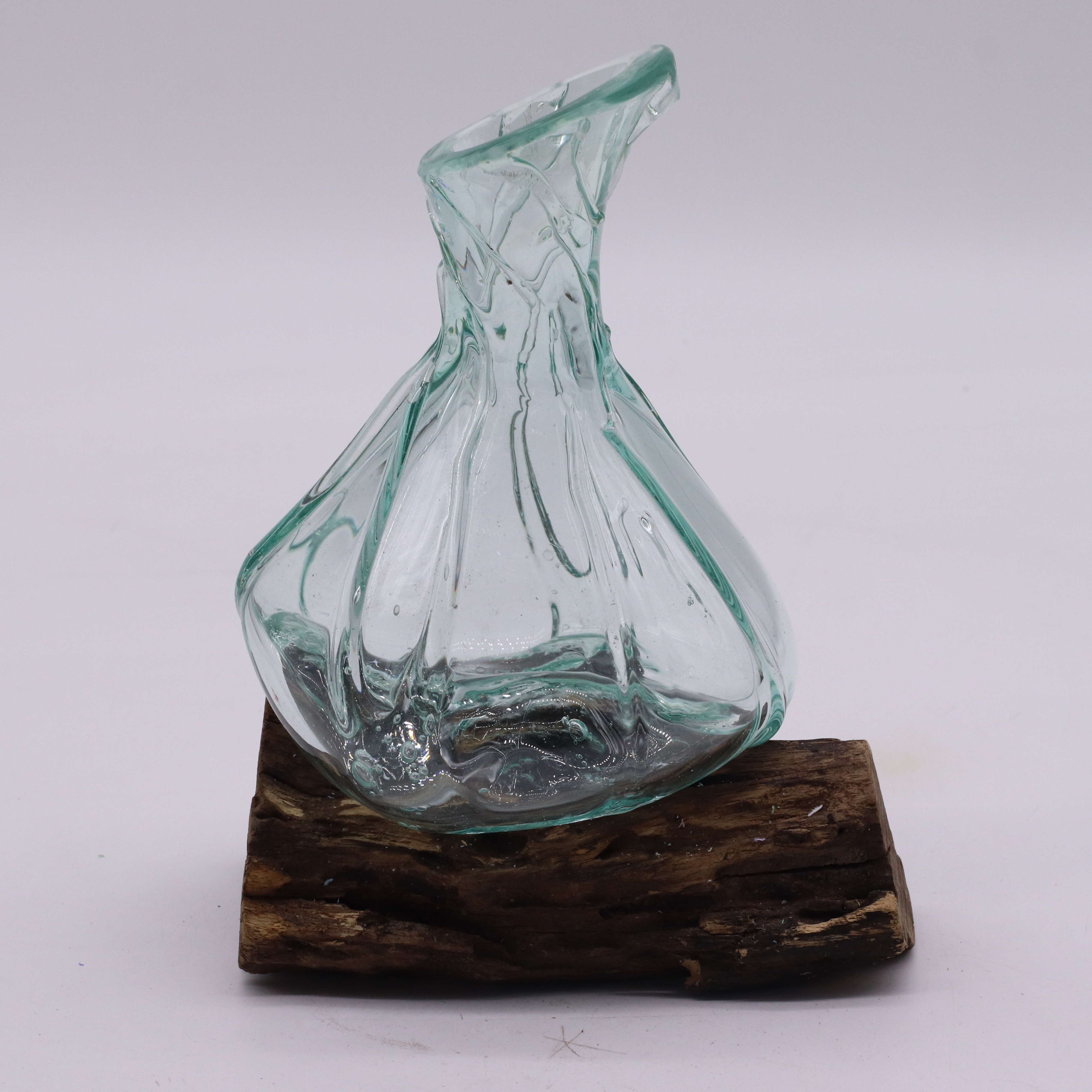 Sie können sie in Küchengeschirr, Wohndekor oder Gastronomiekollektionen integrieren – ihr handwerklicher Charme zieht Kunden an, die einzigartige, handgefertigte Stücke mit einer Geschichte schätzen. Die sanften Rundungen des Glases bilden einen schönen Kontrast zum rauen Holz und schaffen ein Objekt, das sowohl luxuriös als auch geerdet wirkt.