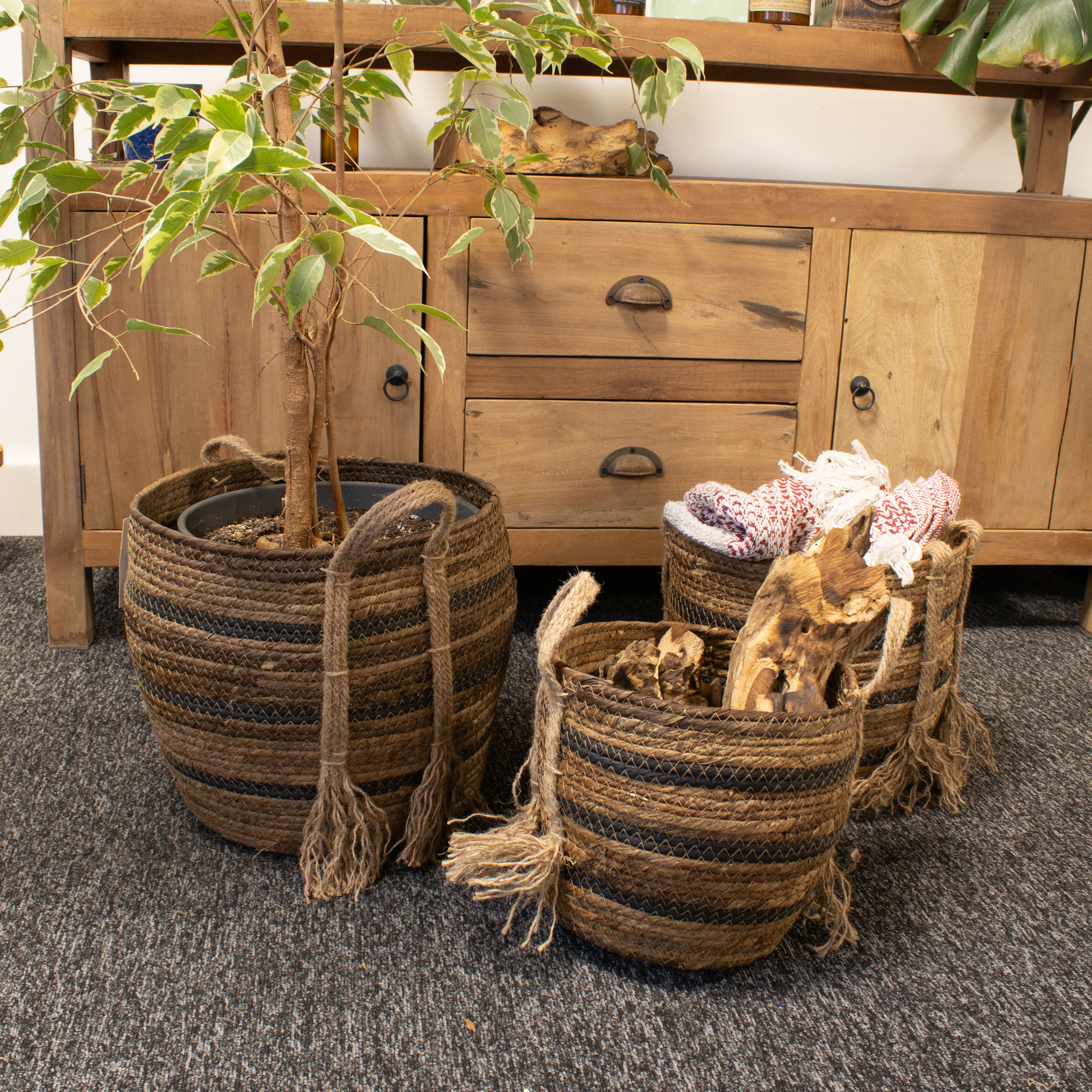 Große Körbe aus Bananenblatt & Seegras – Natural Browns werden handgewebt aus natürlichen Bananenblatt- und Seegrasfasern unter Verwendung einer traditionellen Spiraltechnik, bei der lange Stränge fest umwickelt und zusammengenäht werden, um eine stabile, strukturierte Form zu schaffen. Die geschichtete Webart erzeugt subtile Farb- und Texturunterschiede, die jedem Korb einen individuellen Charakter verleihen, während die natürlichen Brauntöne ein harmonisches Gesamtbild ergeben. Dekorative Quasten und stabile Seilgriffe verleihen einen entspannten, handgefertigten Akzent und unterstreichen die handwerkliche Qualität des Designs.