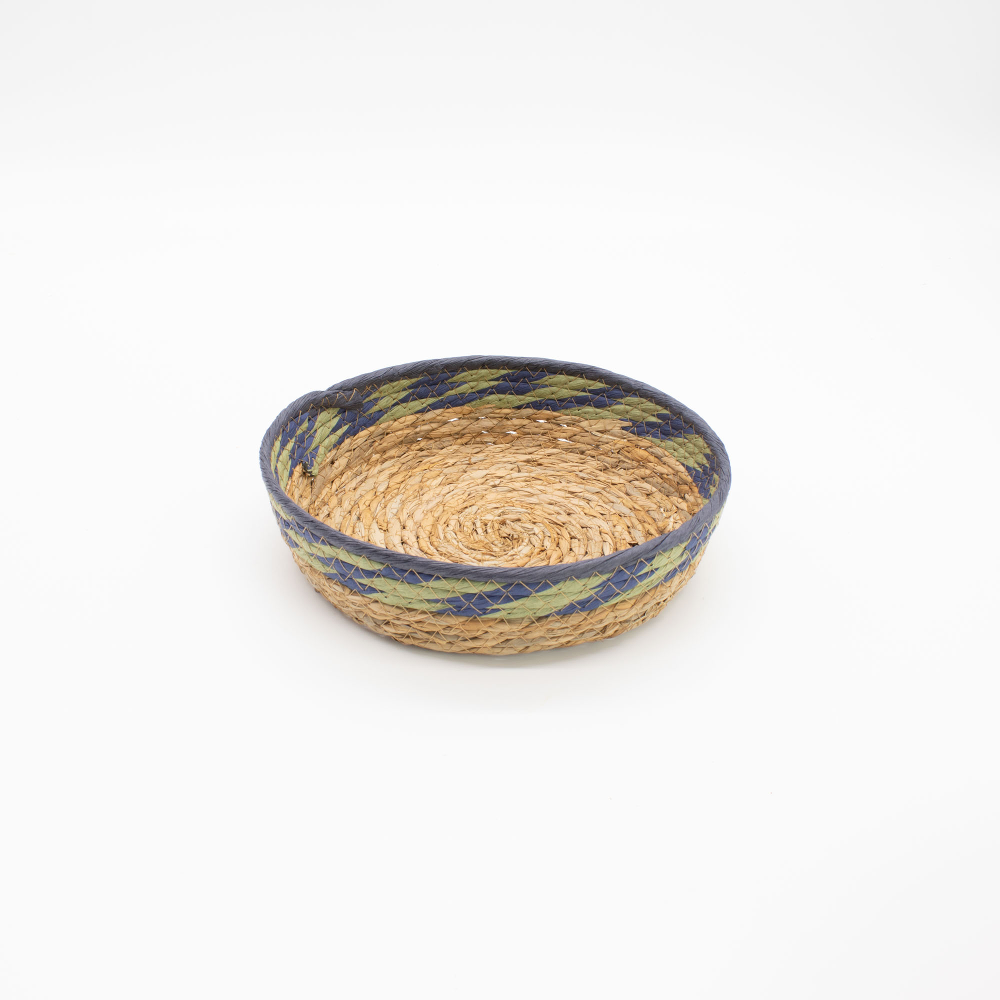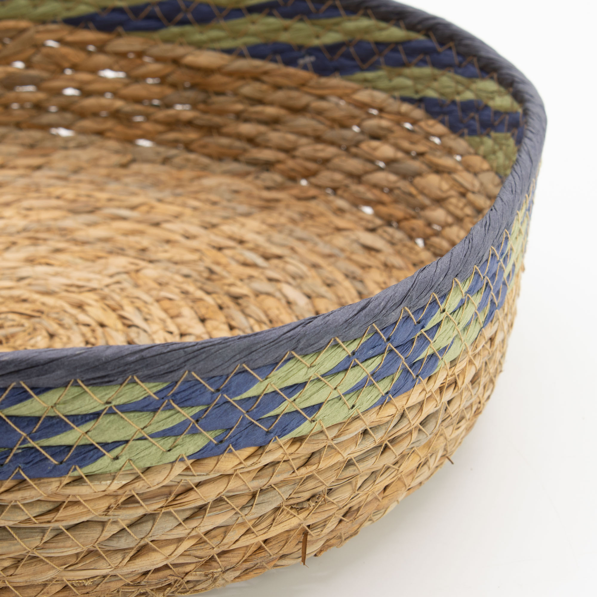 Tablett-Körbe aus Stroh & Seegras – Natural mit Grün & Blau werden handgewebt aus fest spiralförmig gedrehten Stroh- und Seegrasfasern, einer traditionellen Technik, die eine stabile, strukturierte Basis schafft und gleichzeitig die natürliche Flexibilität des Materials erhält. Die Webstruktur zeigt feine Farbnuancen in den Fasern, während die blauen und grünen Kantenakzente jedem Stück einen sanften Farbtupfer verleihen und den handgefertigten Charakter betonen.
