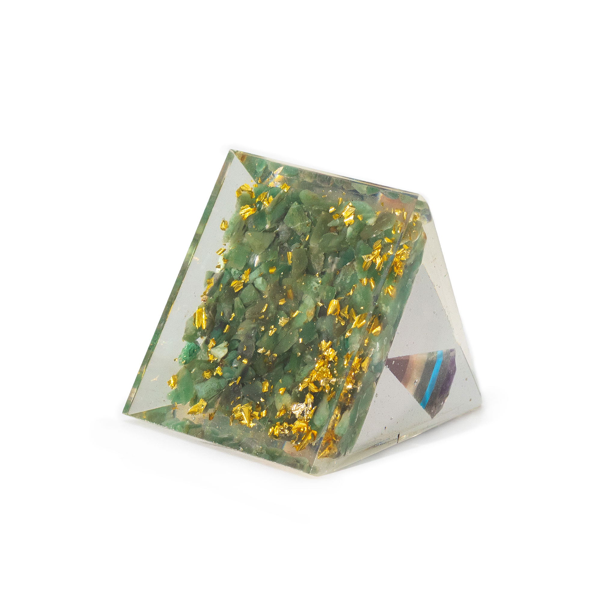 Verleihen Sie Ihrer Kristallsammlung mit der mittelgroßen Orgonit-Pendelpyramide mit grünen Aventurin-Splittern ein Gefühl von Ausgeglichenheit und Erneuerung. Dieses kunstvoll handgefertigte Schmuckstück aus Harz, Metall und echten Edelsteinen besticht durch eine schwebende Pendelspitze, die von grünen Aventurin-Splittern umgeben ist. Diese symbolisieren Wohlstand, emotionale Heilung und Harmonie.
