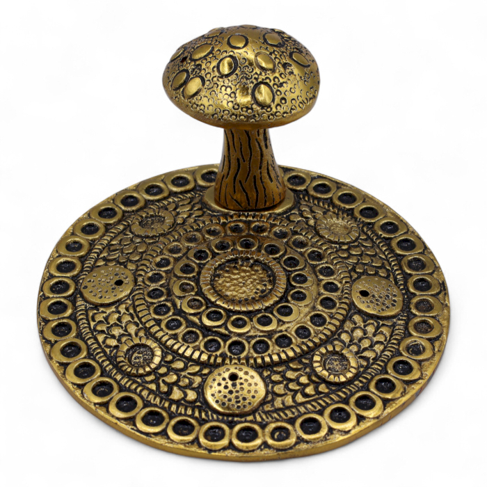 Der Pilzteller Räucherstäbchenhalter verleiht jedem Raum einen charmanten, von der Natur inspirierten Akzent. In einem Vintage-Messing-Effekt gehalten, zeigt er einen kunstvoll gestalteten Pilz, der aus einem filigran gemusterten Teller emporragt – ein dekoratives Highlight, selbst wenn er gerade nicht benutzt wird.