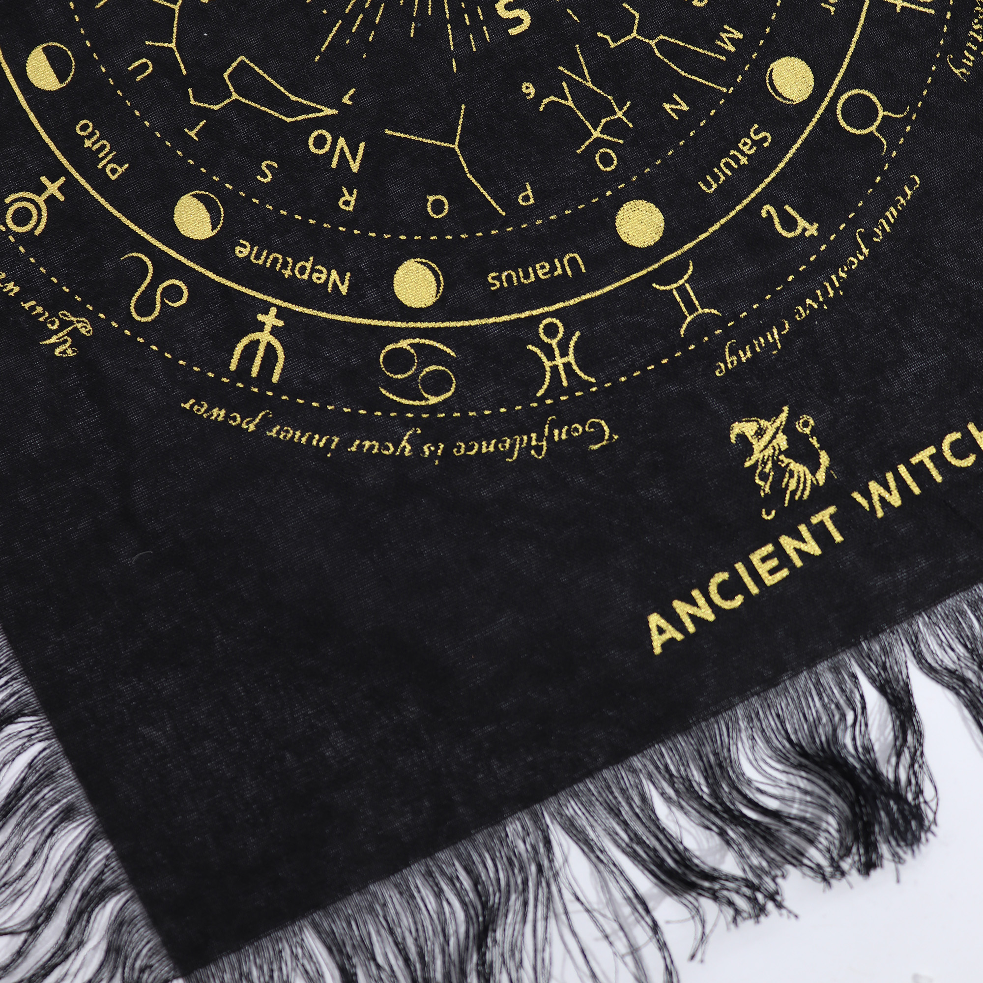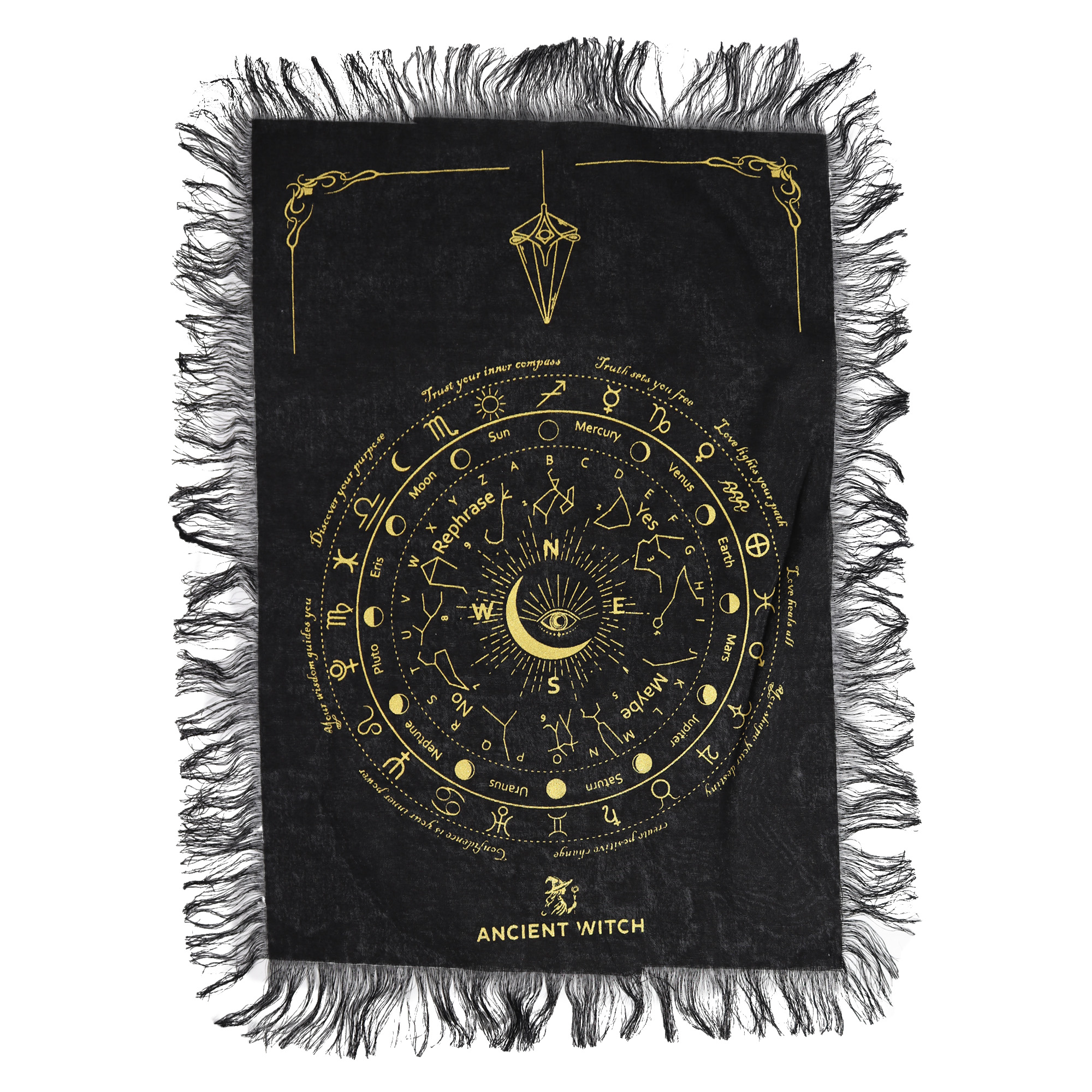 Das detaillierte, kreisförmige Layout bietet eine strukturierte Fläche für Pendel-Lesungen, Tarot-Legungen oder Kristallanordnungen und hilft Kunden, einen fokussierten und bewusst gestalteten Raum zu schaffen. Die dekorative Fransenbordüre verleiht Textur und Bewegung und steigert die visuelle Attraktivität im Geschäft.