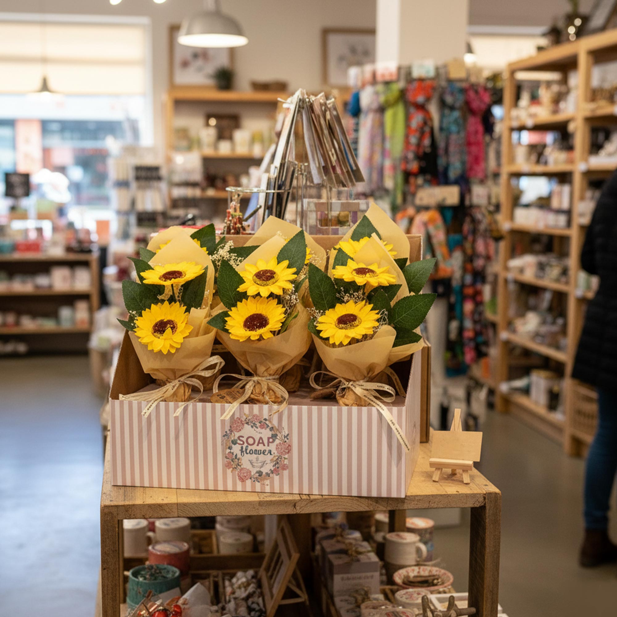 Jede Displaybox enthält sechs wunderschöne Seifensträuße mit jeweils zwei wunderschön arrangierten und perfekt verpackten Sonnenblumen – direkt verkaufsfertig.