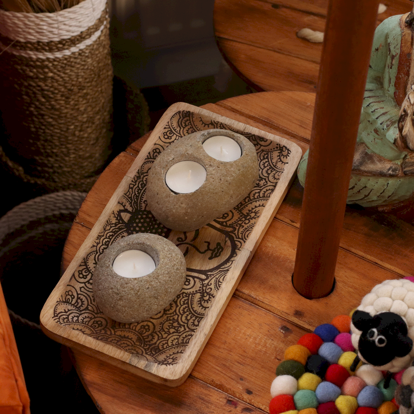 Verleihen Sie Ihrem Sortiment mit diesen handgefertigten Flussstein-Kerzenhaltern aus Indonesien einen Hauch von Natur.