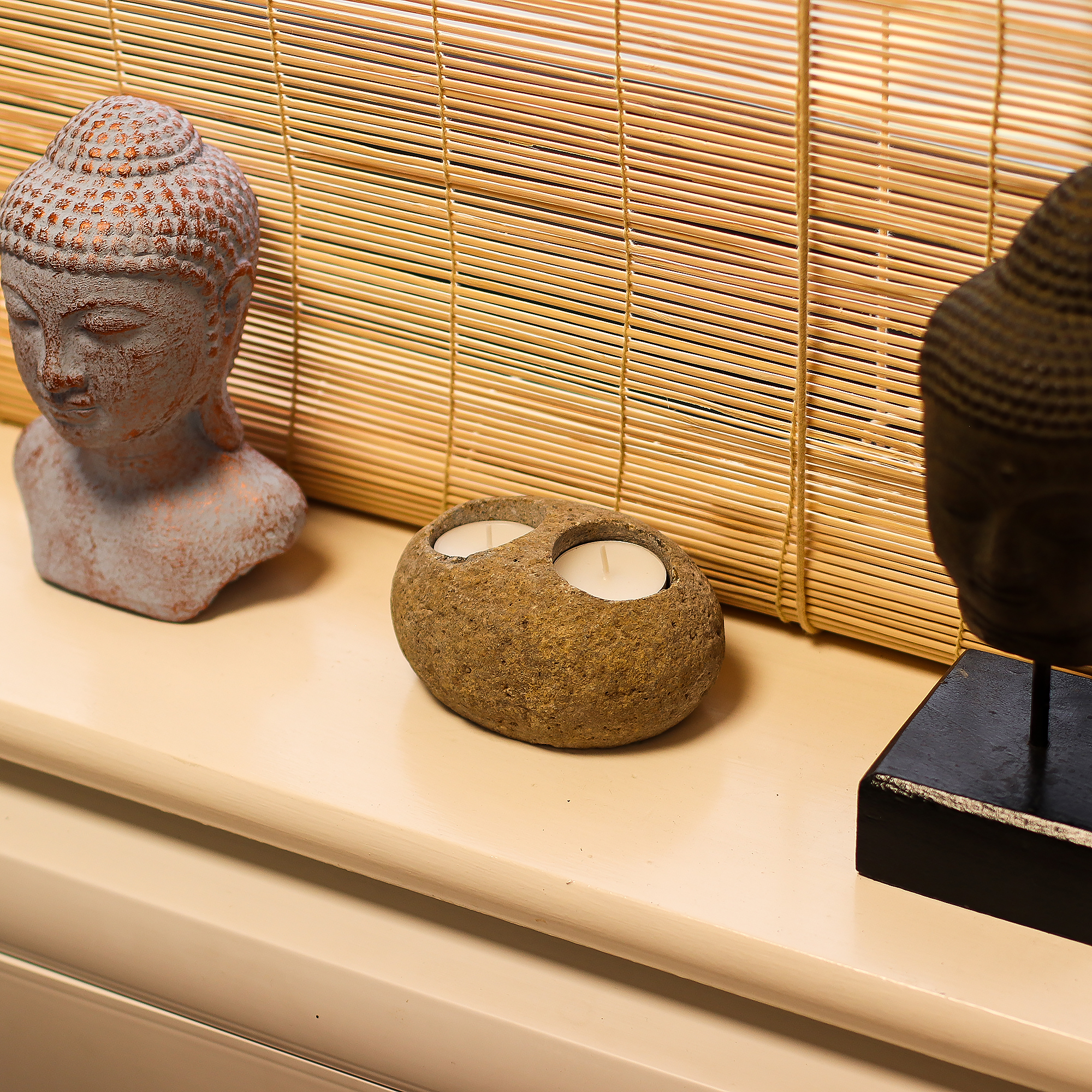 Jedes Stück ist ein Unikat und unterstreicht die natürliche Textur und den Farbton des Steins, aus dem es gefertigt wurde. Er bietet Platz für zwei Teelichter und schafft eine sanfte, ruhige Atmosphäre – perfekt für Entspannungsecken, Wellness-Ausstellungen oder naturinspirierte Geschenkkollektionen.