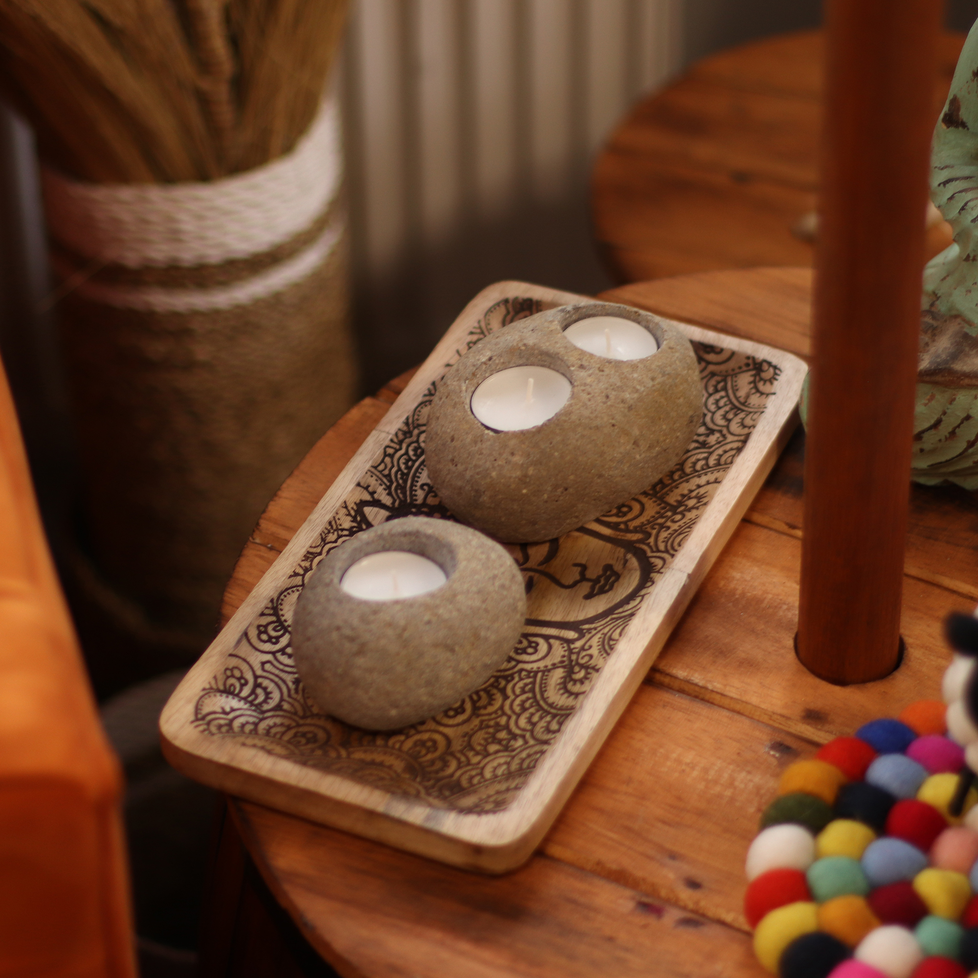 Dieser handgefertigte doppelte Nachtlichthalter aus echten Flusssteinen bringt mühelos Harmonie und Ausgeglichenheit in jeden Raum.