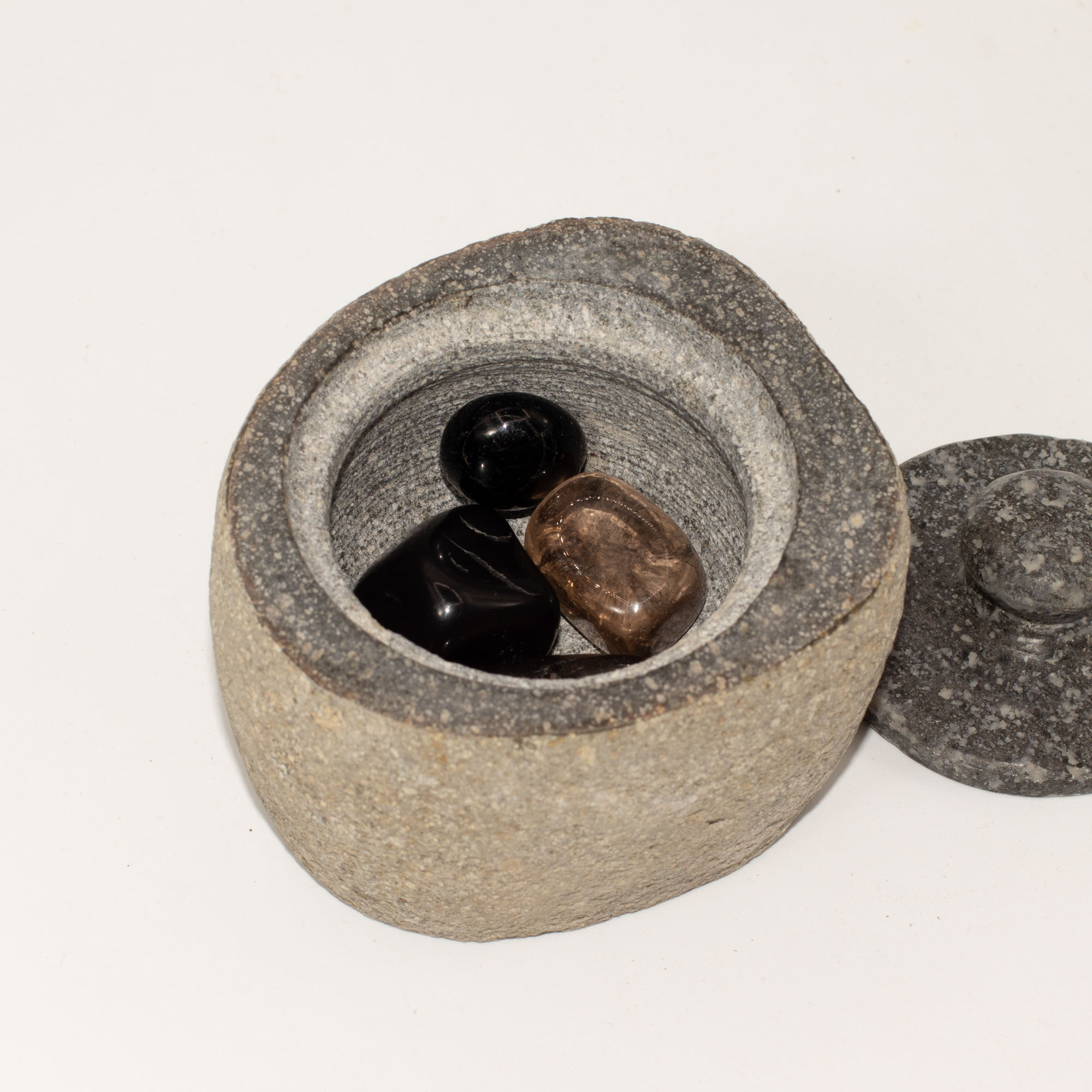 Dieser kleine Erdungs-Topf ist aus massivem Flussstein gefertigt und bewahrt das natürliche Gewicht, die Textur und die organische Form des Steins. Innen glatt und außen roh, liegt er angenehm in der Hand und wirkt dezent erdend auf jeder Oberfläche.