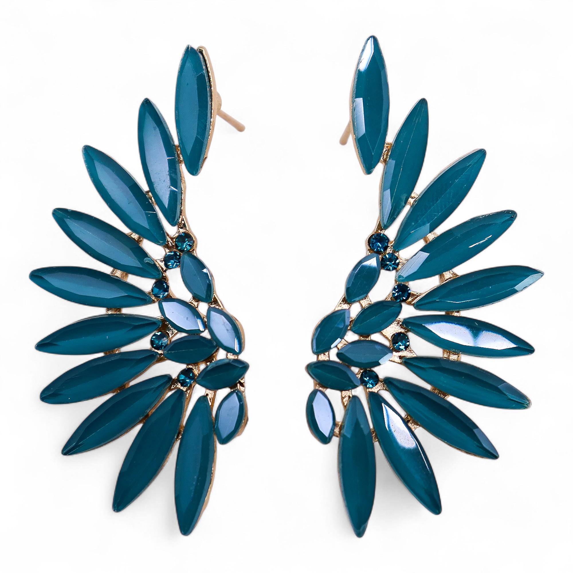 Diese Engelsflügel-Ohrringe bestechen durch tiefblaugrüne Glasakzente, die das Licht wie Meeresgischt einfangen. Das Flügeldesign symbolisiert Bewegung und Freiheit und ist ein markantes und dennoch tragbares Schmuckstück. Ideal für Einzelhändler, die eleganten, farbenfrohen Schmuck suchen, der Symbolik und Stil vereint.