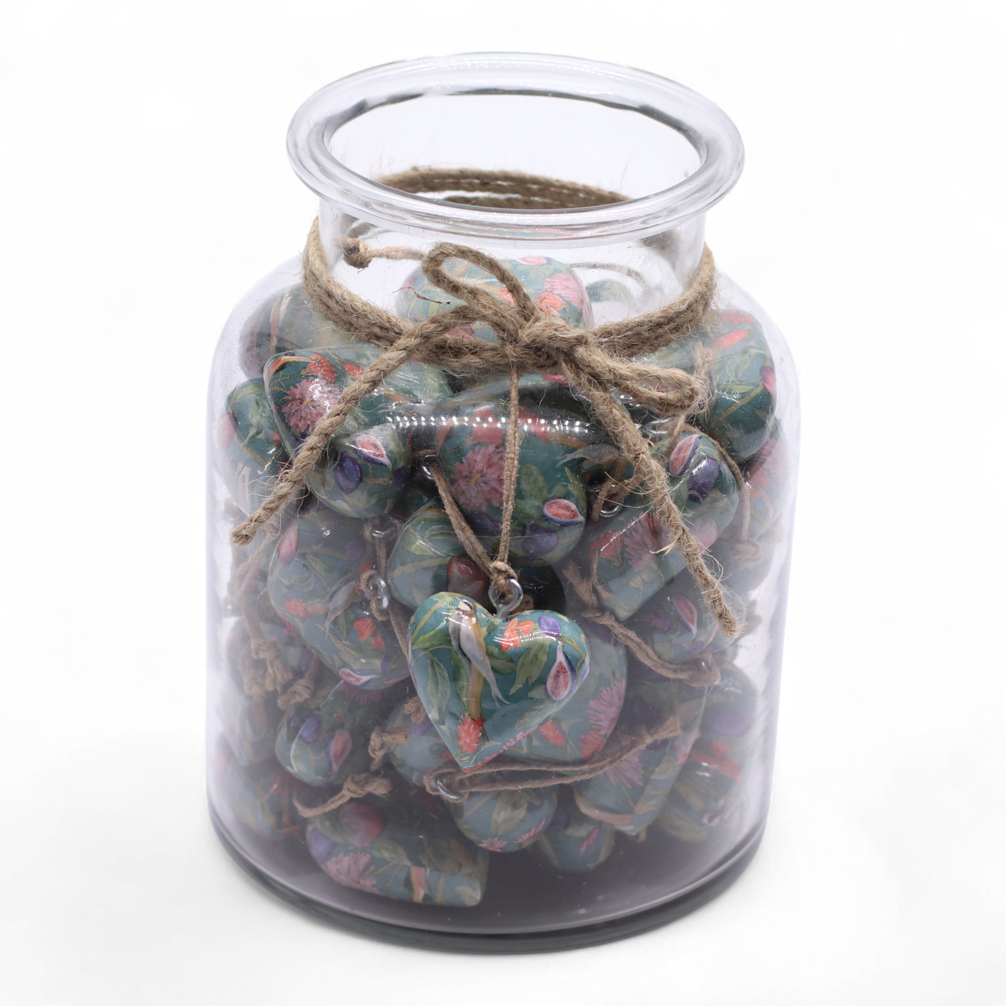 Bereichern Sie Ihr saisonales Sortiment mit diesem charmanten Präsentationsglas für ca. 50 große Holzherzen mit Vogel- und Blumenmotiv. Jedes Herz ist mit einem hübschen Vogel- und Blütenmotiv verziert und verleiht Ihrer Weihnachtsdekoration, Ihren Geschenken oder Ihrer Wohnungseinrichtung eine zarte, märchenhafte Note.