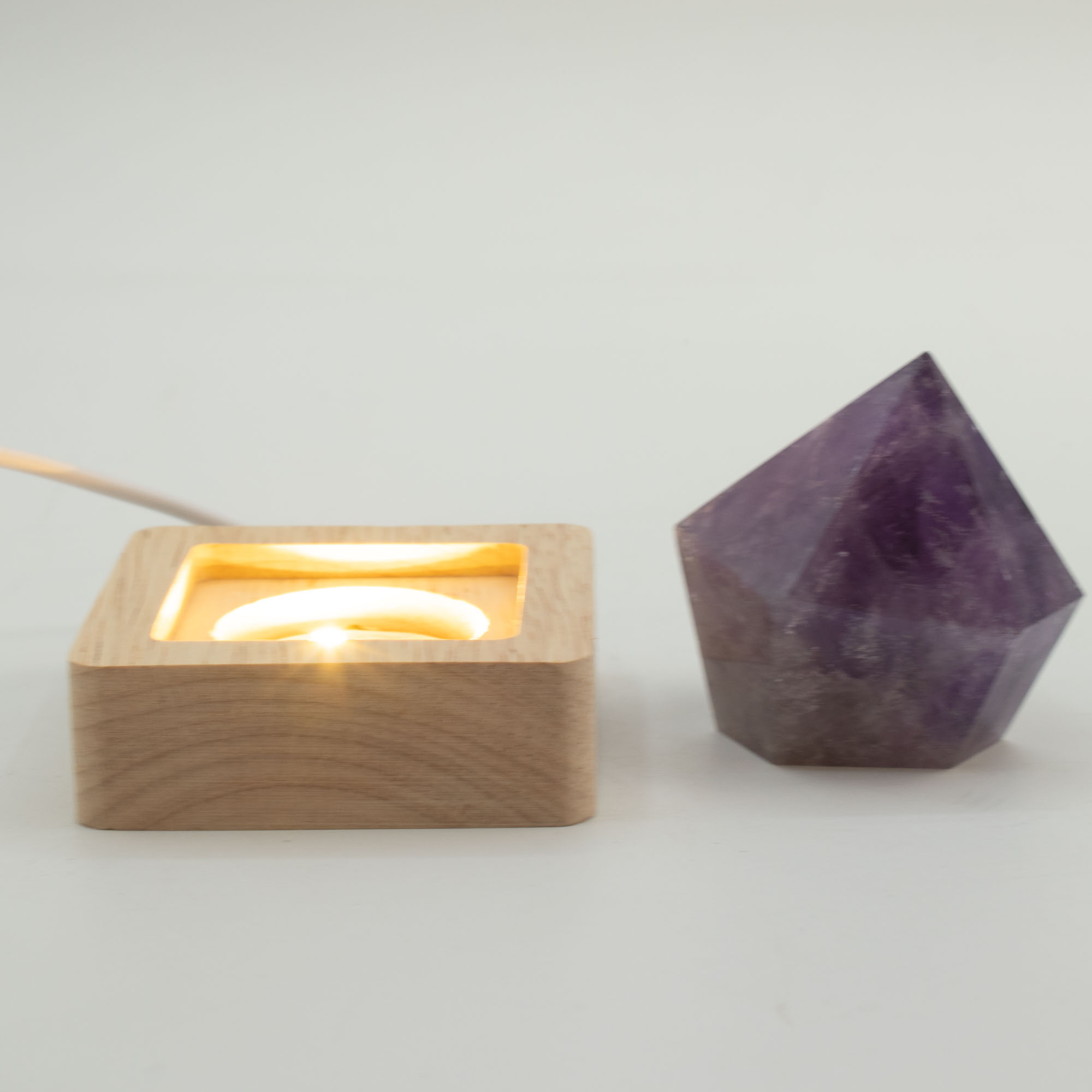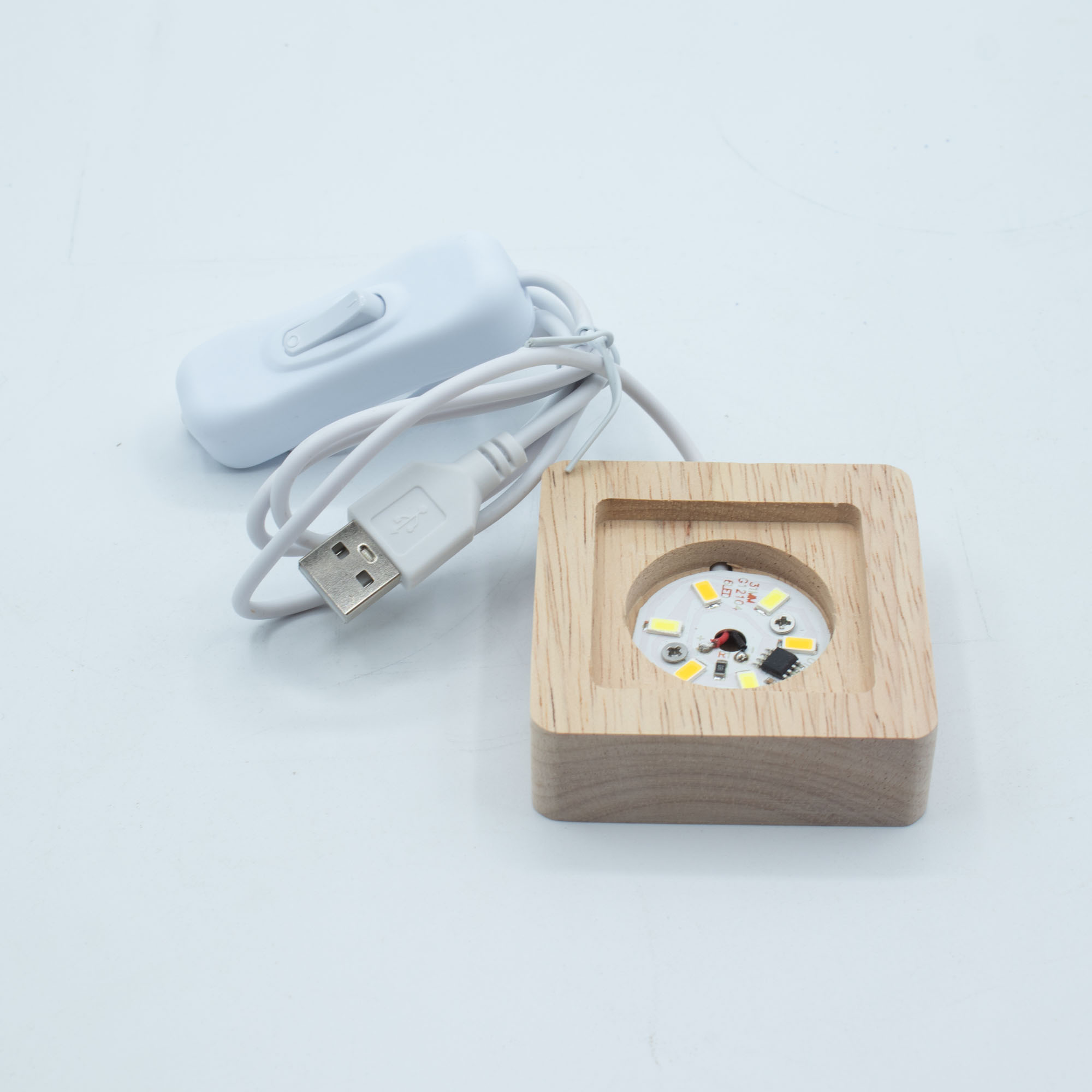 Produktdetails: • Basisgröße: 6 cm quadratisch • Material: Naturholz • Stromversorgung: USB • Lichtoptionen: Kaltweiß, Warmweiß oder Tageslicht-LED • Bedienung: Inline-Ein-/Ausschalter • Empfohlen für: Kristalle, Glasobjekte, Resin-Kunst, polierte Steine und kleinere dekorative Displays